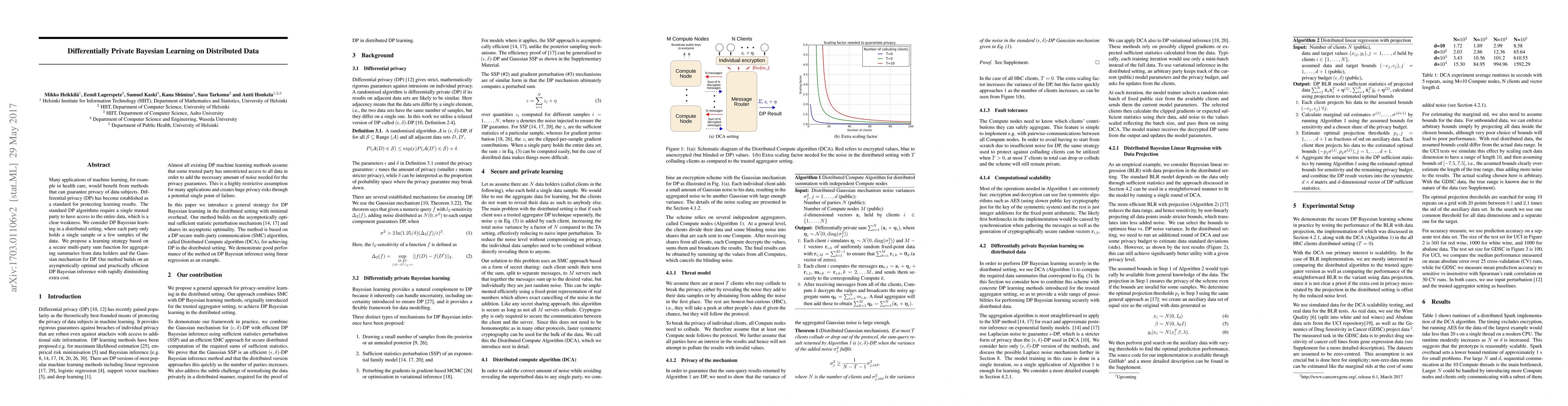 Many applications of machine learning, for example in health care, would benefit from methods that can guarantee privacy of data subjects. Differential privacy (DP) has become established as a standard for protecting learning results. The standard DP algorithms require a single trusted party to have access to the entire data, which is a clear weakness. We consider DP Bayesian learning in a distributed setting, where each party only holds a single sample or a few samples of the data. We propose a learning strategy based on a secure multi-party sum function for aggregating summaries from data holders and the Gaussian mechanism for DP. Our method builds on an asymptotically optimal and practically efficient DP Bayesian inference with rapidly diminishing extra cost.