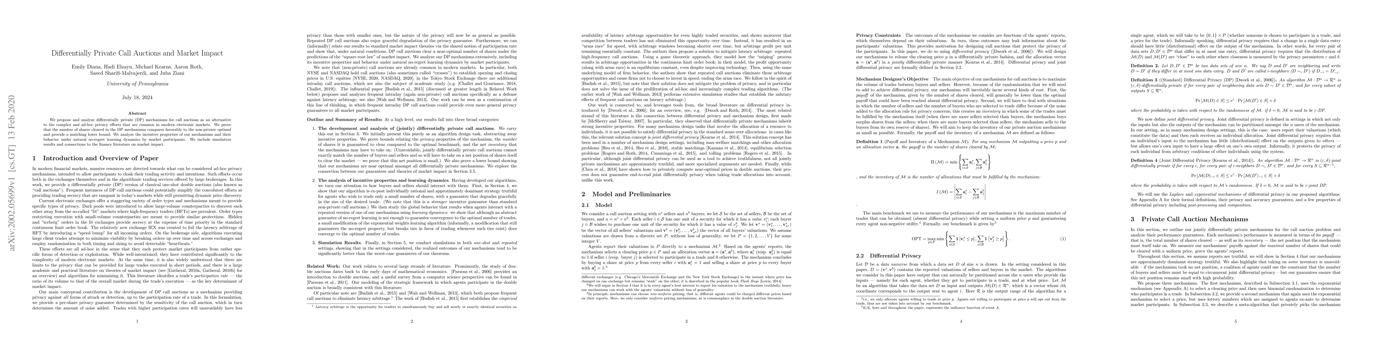 This paper proposes differentially private mechanisms for call auctions, demonstrating their effectiveness in terms of cleared shares compared to non-private methods, and analyzes their incentive properties and market impact under no-regret learning. Simulation results support the theoretical findings.