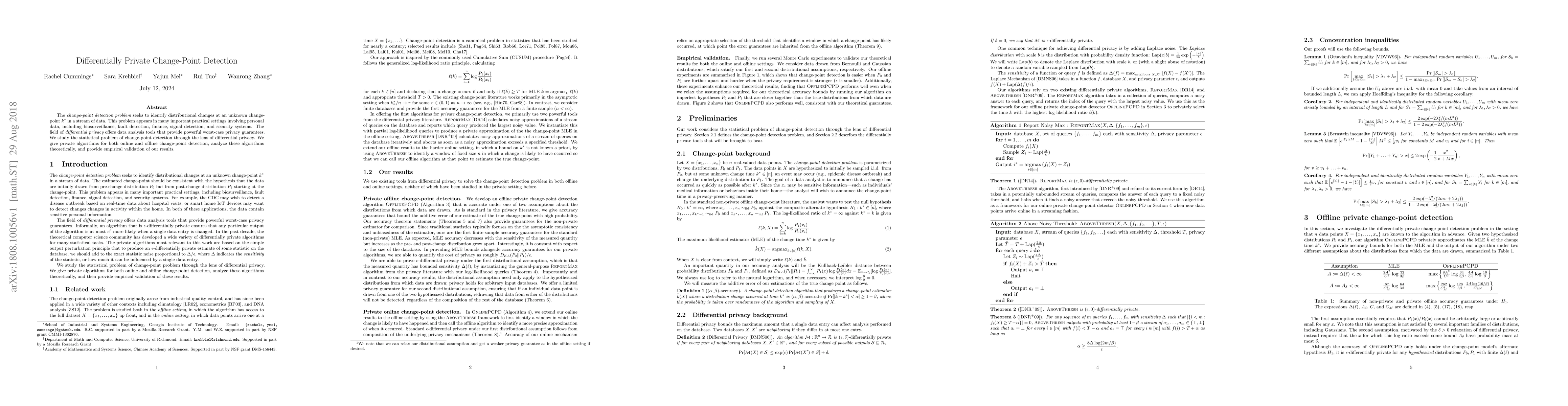 This paper presents differentially private algorithms for detecting distributional changes in data streams, offering robust privacy guarantees while addressing practical applications in biosurveillance, fault detection, finance, and security. The study includes both online and offline detection methods, supported by theoretical analysis and empirical validation.