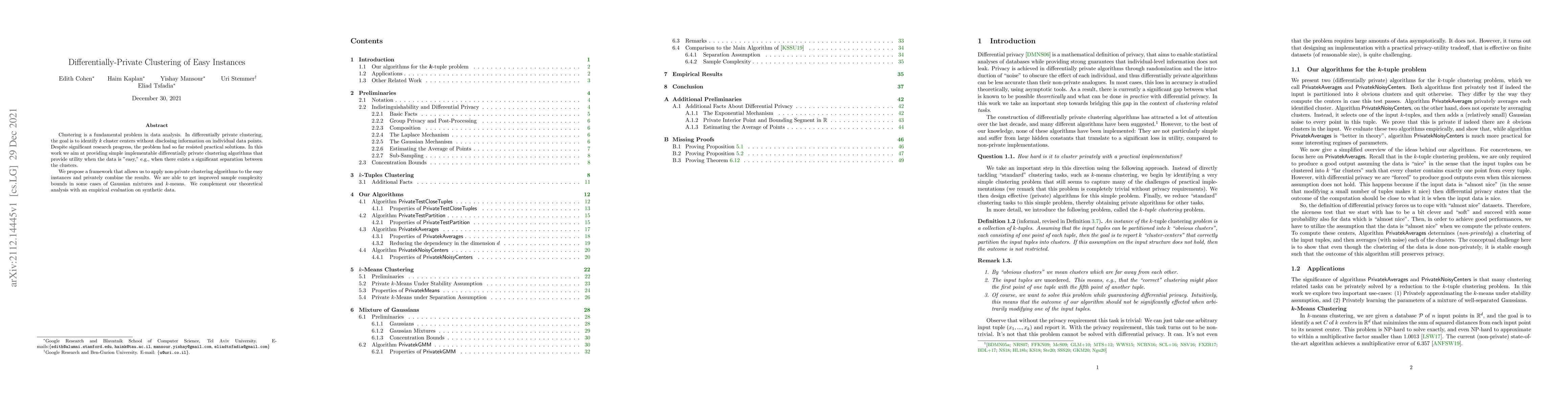 This paper presents a framework for differentially private clustering of "easy" data instances with significant cluster separation, proposing implementable algorithms that combine non-private clustering methods with privacy guarantees. The theoretical analysis demonstrates improved sample complexity bounds, validated through empirical evaluation on synthetic data.