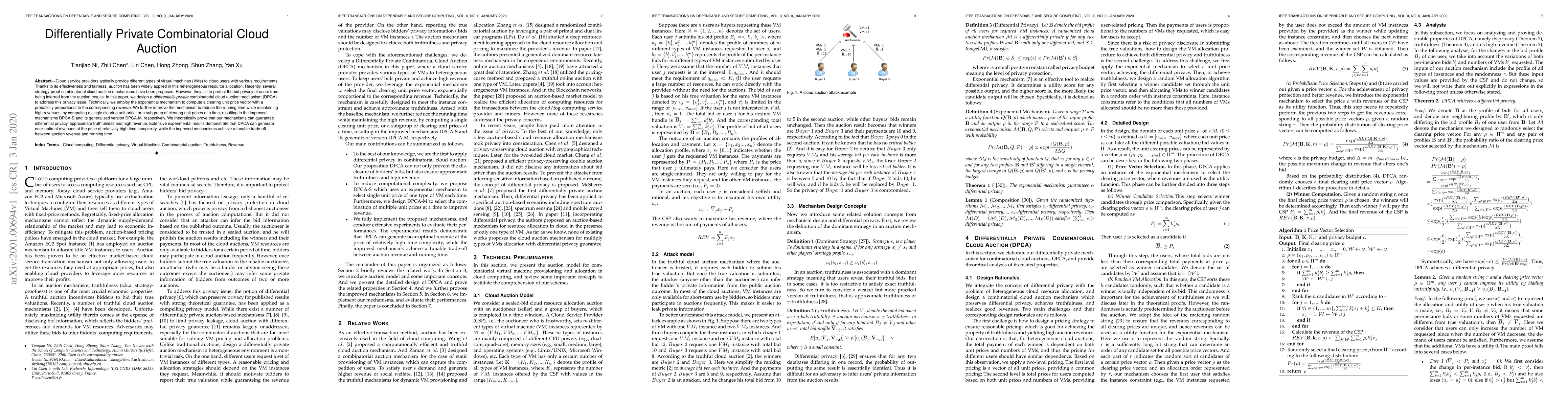 This paper proposes a differentially private combinatorial cloud auction mechanism (DPCA) to protect bid privacy while ensuring fairness and efficiency in resource allocation. The authors improve the mechanism with DPCA-S and DPCA-M to balance revenue and running time, proving their effectiveness in maintaining differential privacy, approximate truthfulness, and high revenue.