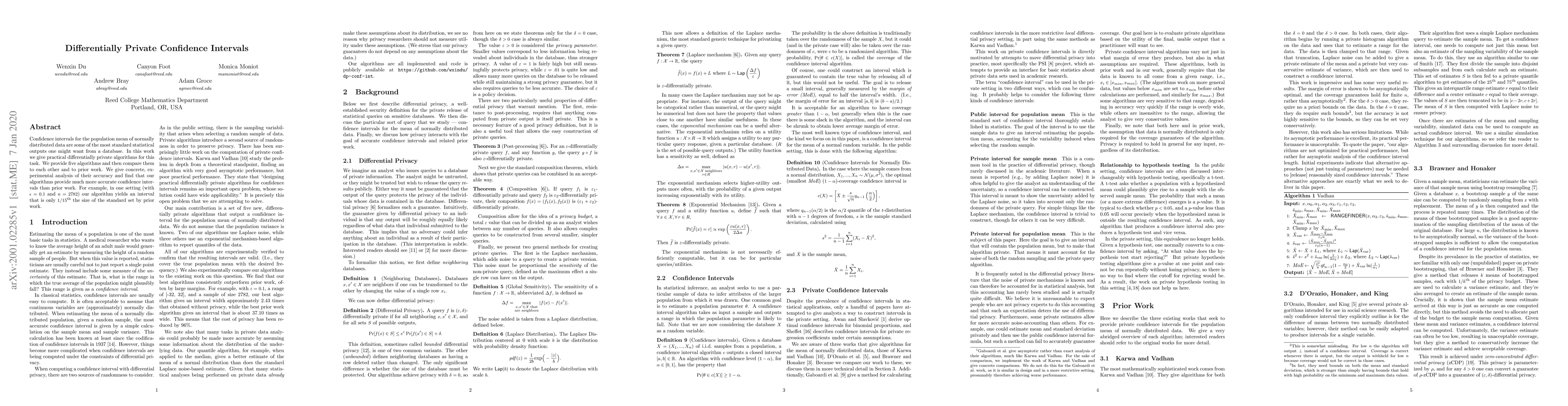 Confidence intervals for the population mean of normally distributed data are some of the most standard statistical outputs one might want from a database. In this work we give practical differentially private algorithms for this task. We provide five algorithms and then compare them to each other and to prior work. We give concrete, experimental analysis of their accuracy and find that our algorithms provide much more accurate confidence intervals than prior work. For example, in one setting (with {\epsilon} = 0.1 and n = 2782) our algorithm yields an interval that is only 1/15th the size of the standard set by prior work.