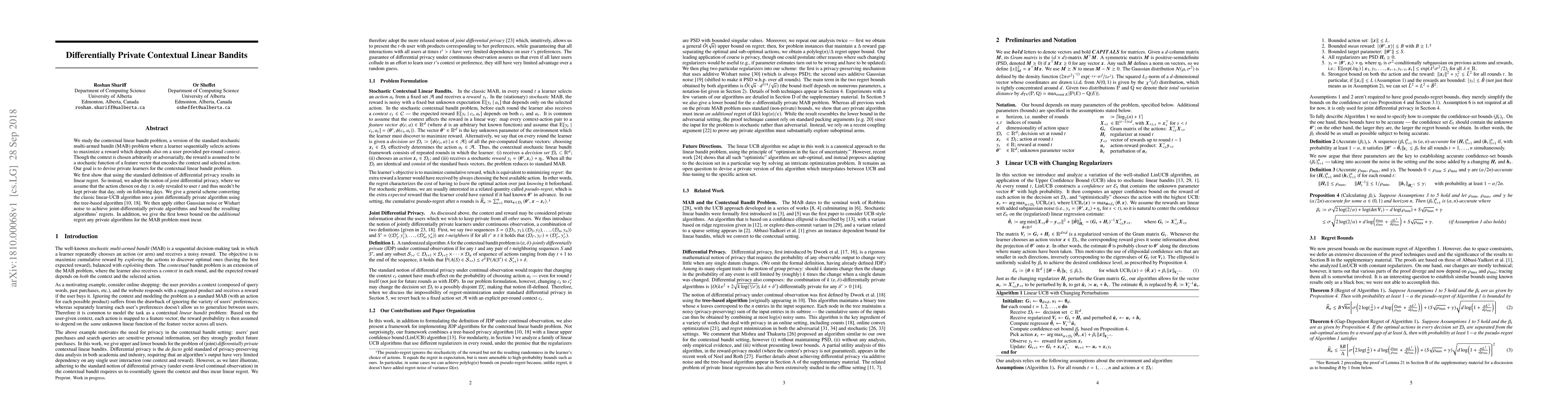 This paper explores differentially private contextual linear bandits, addressing the challenge of maintaining privacy while maximizing rewards based on context and actions. It proposes a joint differential privacy approach, converting the linear-UCB algorithm into a private version using tree-based methods, and provides bounds on the regret incurred by these methods.