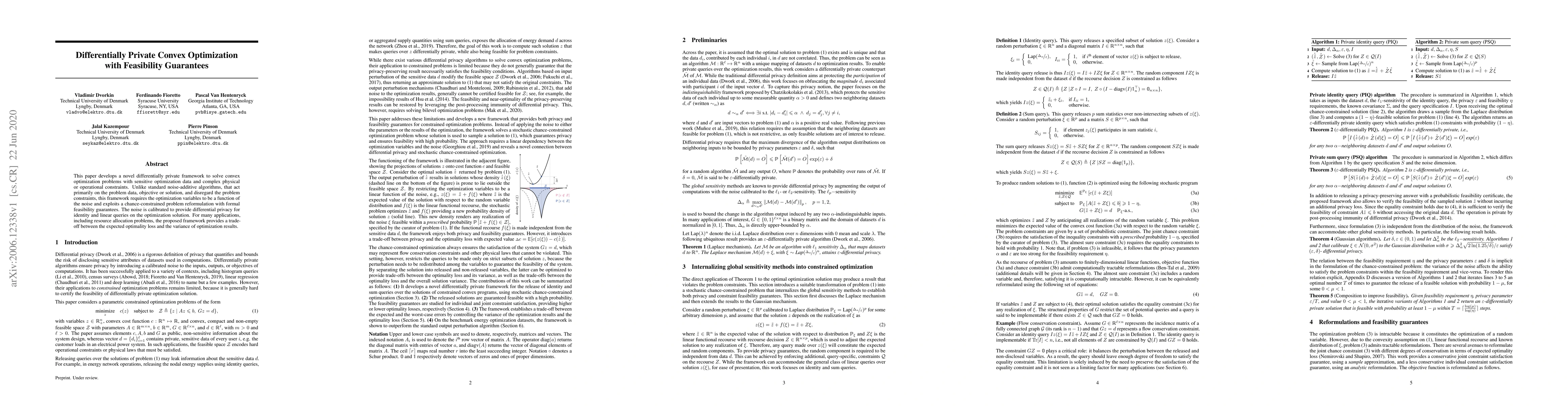 This paper introduces a differentially private framework for solving convex optimization problems with complex constraints, ensuring feasibility through a chance-constrained reformulation. It provides differential privacy for identity and linear queries while maintaining a trade-off between optimality and noise variance.