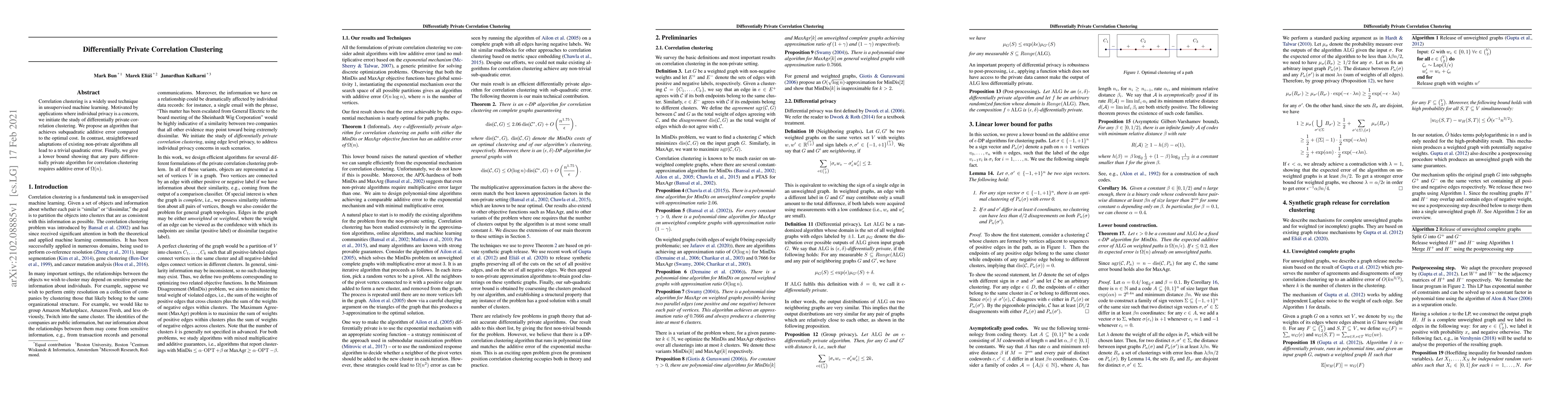 Summary: This paper proposes a novel differentially private algorithm for correlation clustering that achieves subquadratic additive error, significantly improving on the quadratic error of non-private adaptations. It also establishes a lower bound indicating that any pure differentially private algorithm must incur an additive error of $\Omega(n)$.