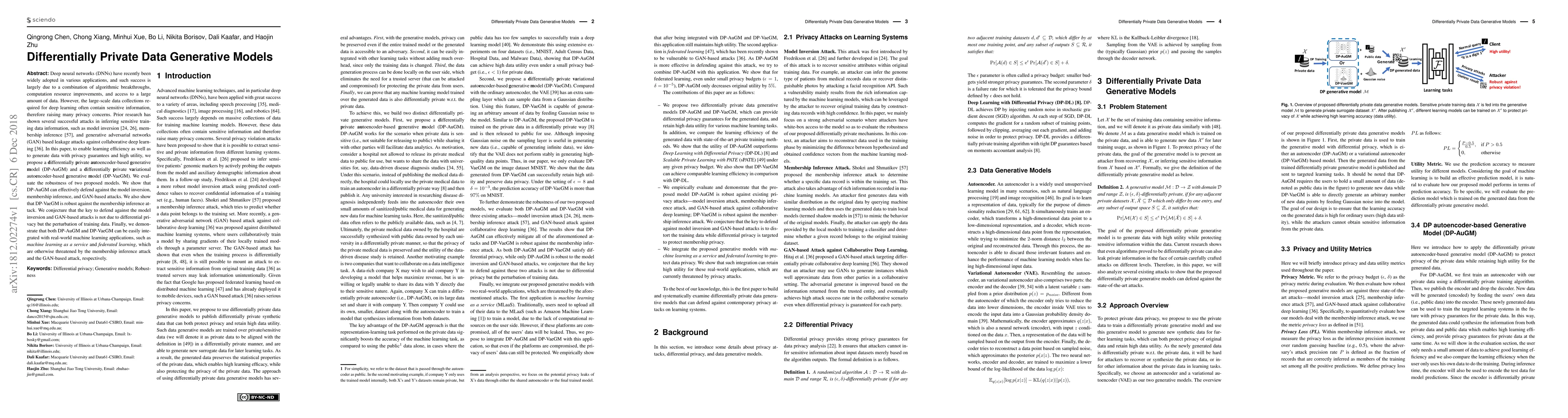 Deep neural networks (DNNs) have recently been widely adopted in various applications, and such success is largely due to a combination of algorithmic breakthroughs, computation resource improvements, and access to a large amount of data. However, the large-scale data collections required for deep learning often contain sensitive information, therefore raising many privacy concerns. Prior research has shown several successful attacks in inferring sensitive training data information, such as model inversion, membership inference, and generative adversarial networks (GAN) based leakage attacks against collaborative deep learning. In this paper, to enable learning efficiency as well as to generate data with privacy guarantees and high utility, we propose a differentially private autoencoder-based generative model (DP-AuGM) and a differentially private variational autoencoder-based generative model (DP-VaeGM). We evaluate the robustness of two proposed models. We show that DP-AuGM can effectively defend against the model inversion, membership inference, and GAN-based attacks. We also show that DP-VaeGM is robust against the membership inference attack. We conjecture that the key to defend against the model inversion and GAN-based attacks is not due to differential privacy but the perturbation of training data. Finally, we demonstrate that both DP-AuGM and DP-VaeGM can be easily integrated with real-world machine learning applications, such as machine learning as a service and federated learning, which are otherwise threatened by the membership inference attack and the GAN-based attack, respectively.