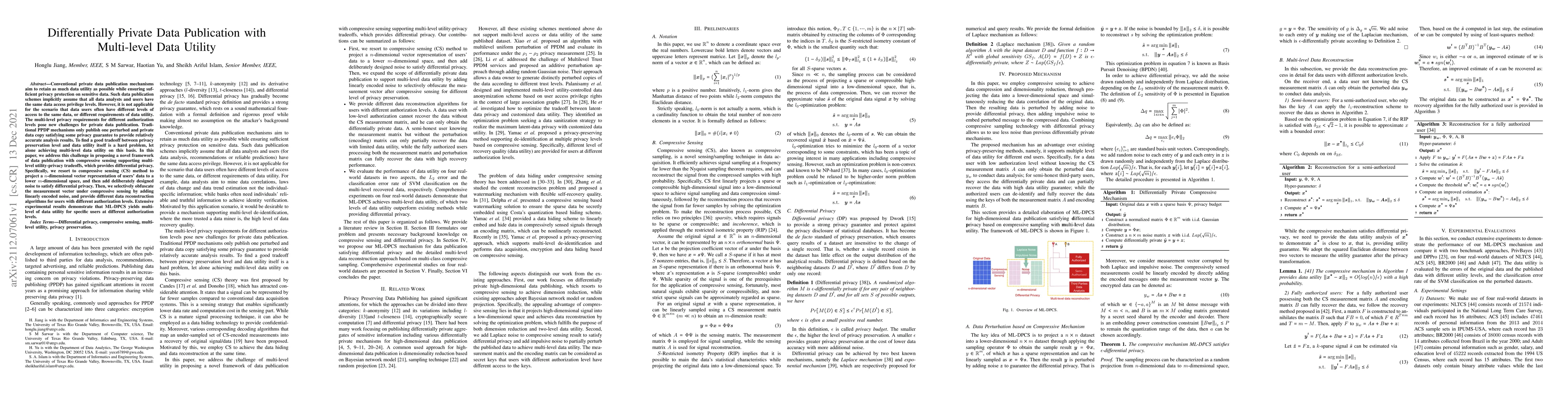 This paper proposes a novel framework for differentially private data publication using compressive sensing to achieve multi-level data utility tailored to different user authorization levels, balancing privacy and data utility effectively. The method selectively obfuscates data through noise addition and provides distinct reconstruction algorithms for users based on their access privileges.