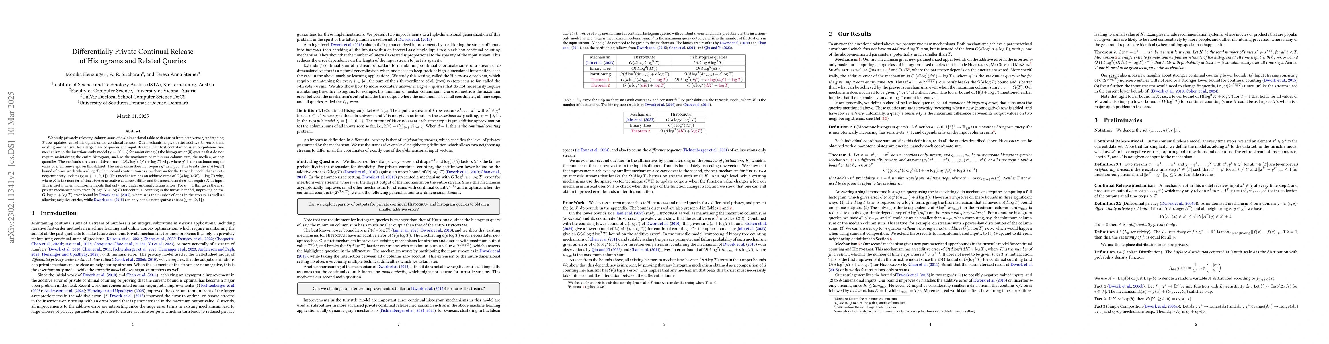 This paper proposes new parameterized upper bounds for maintaining differentially private histograms and related queries under continual observation, achieving error rates of $O(d\log^2 c_{\max}+\log T)$ for $\epsilon$-differential privacy and $O(\sqrt{d}\log^{3/2}c_{\max}+\log T)$ for $(\epsilon,\delta)$-differential privacy. It also establishes a lower bound of $\Omega(d \log T)$ to explain the limitations of existing mechanisms.