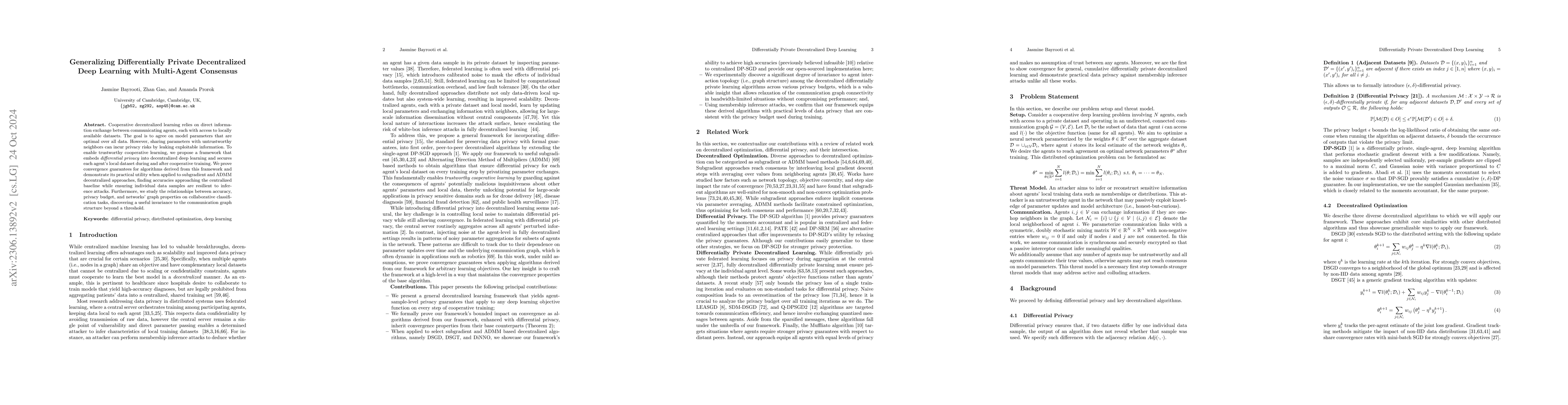 This paper introduces differentially private algorithms for decentralized deep learning that secure agents' local datasets while achieving consensus on model parameters. It generalizes DP-SGD to decentralized methods and demonstrates performance comparable to centralized models, maintaining privacy under sparse graphs and non-uniform data distributions.