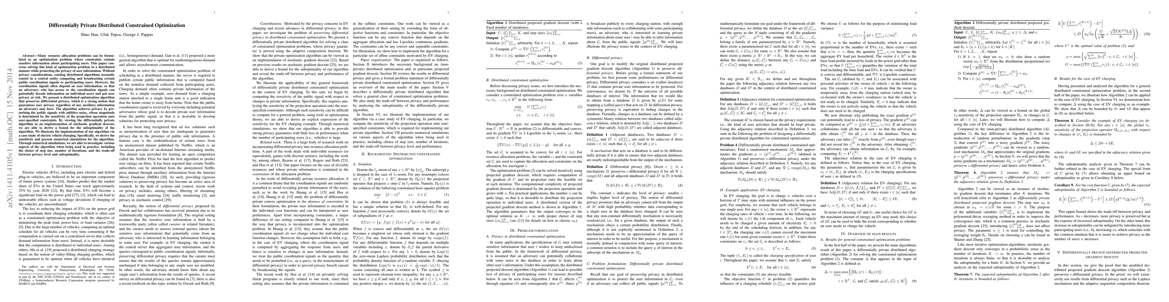 Many resource allocation problems can be formulated as an optimization problem whose constraints contain sensitive information about participating users. This paper concerns solving this kind of optimization problem in a distributed manner while protecting the privacy of user information. Without privacy considerations, existing distributed algorithms normally consist in a central entity computing and broadcasting certain public coordination signals to participating users. However, the coordination signals often depend on user information, so that an adversary who has access to the coordination signals can potentially decode information on individual users and put user privacy at risk. We present a distributed optimization algorithm that preserves differential privacy, which is a strong notion that guarantees user privacy regardless of any auxiliary information an adversary may have. The algorithm achieves privacy by perturbing the public signals with additive noise, whose magnitude is determined by the sensitivity of the projection operation onto user-specified constraints. By viewing the differentially private algorithm as an implementation of stochastic gradient descent, we are able to derive a bound for the suboptimality of the algorithm. We illustrate the implementation of our algorithm via a case study of electric vehicle charging. Specifically, we derive the sensitivity and present numerical simulations for the algorithm. Through numerical simulations, we are able to investigate various aspects of the algorithm when being used in practice, including the choice of step size, number of iterations, and the trade-off between privacy level and suboptimality.