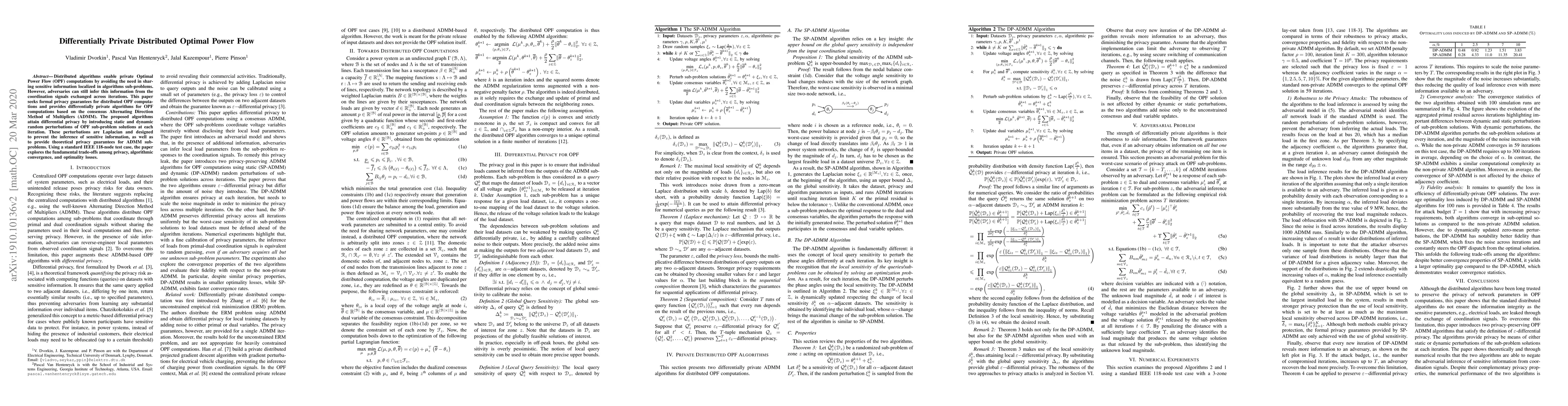 This paper develops differentially private algorithms for distributed Optimal Power Flow (OPF) computations using consensus Alternating Direction Method of Multipliers (ADMM). It introduces Laplacian random perturbations to provide privacy guarantees while exploring trade-offs among privacy, convergence, and optimality using an IEEE 118-node test case.