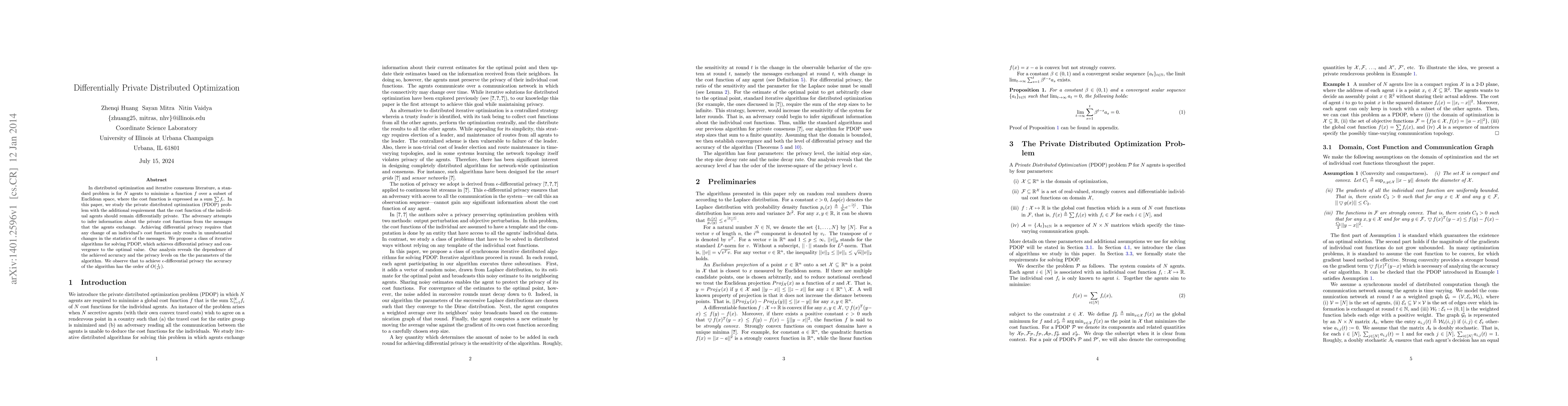 In distributed optimization and iterative consensus literature, a standard problem is for $N$ agents to minimize a function $f$ over a subset of Euclidean space, where the cost function is expressed as a sum $\sum f_i$. In this paper, we study the private distributed optimization (PDOP) problem with the additional requirement that the cost function of the individual agents should remain differentially private. The adversary attempts to infer information about the private cost functions from the messages that the agents exchange. Achieving differential privacy requires that any change of an individual's cost function only results in unsubstantial changes in the statistics of the messages. We propose a class of iterative algorithms for solving PDOP, which achieves differential privacy and convergence to the optimal value. Our analysis reveals the dependence of the achieved accuracy and the privacy levels on the the parameters of the algorithm. We observe that to achieve $\epsilon$-differential privacy the accuracy of the algorithm has the order of $O(\frac{1}{\epsilon^2})$.