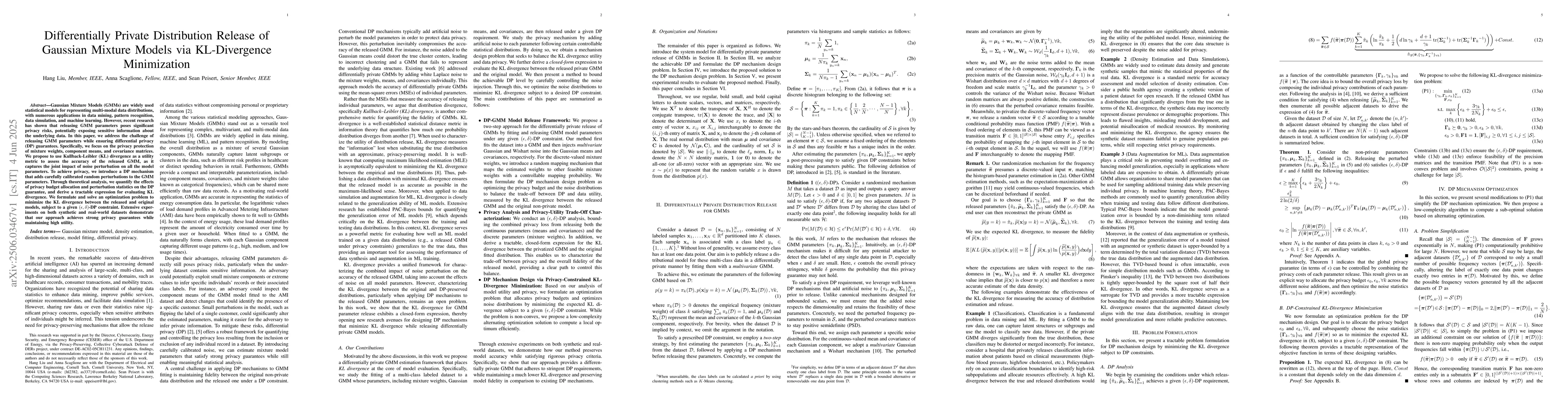 The paper introduces a DP mechanism for GMM parameter release, utilizing KL divergence minimization under $(\epsilon, \delta)$-DP constraints, along with theoretical analysis of privacy budget allocation.