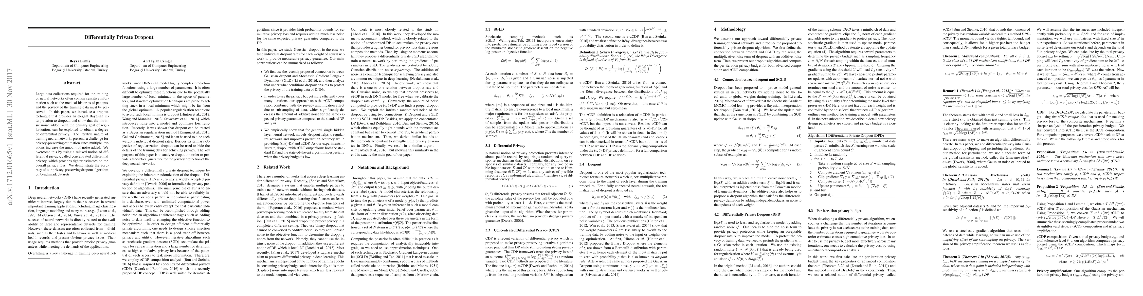Researchers introduce a dropout technique that provides differential privacy for neural networks while preserving training data privacy, using concentrated differential privacy to mitigate the impact of noise from iterative training.
