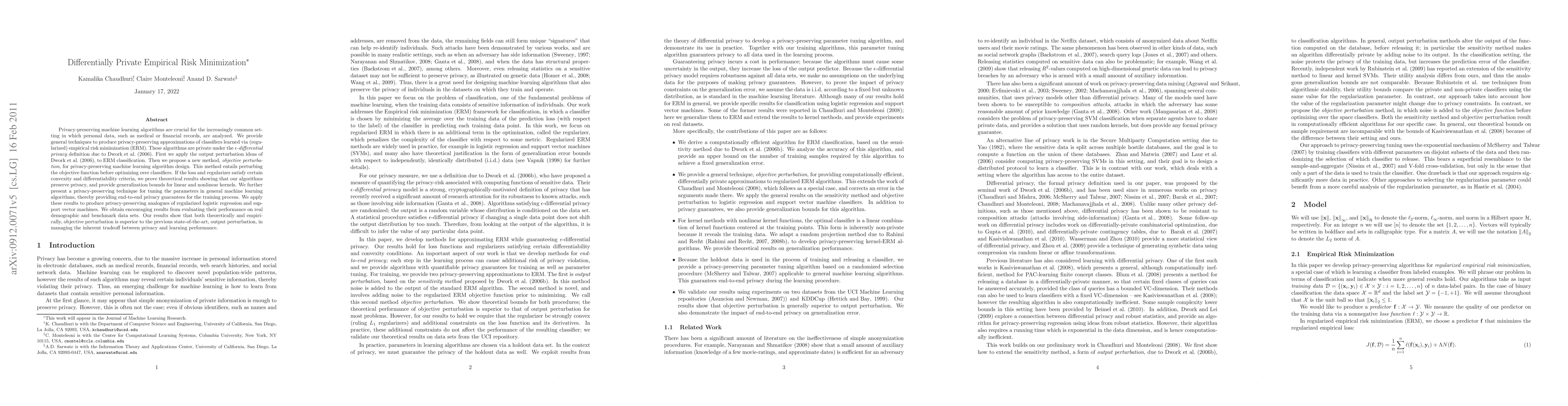 Privacy-preserving machine learning algorithms are crucial for the increasingly common setting in which personal data, such as medical or financial records, are analyzed. We provide general techniques to produce privacy-preserving approximations of classifiers learned via (regularized) empirical risk minimization (ERM). These algorithms are private under the $\epsilon$-differential privacy definition due to Dwork et al. (2006). First we apply the output perturbation ideas of Dwork et al. (2006), to ERM classification. Then we propose a new method, objective perturbation, for privacy-preserving machine learning algorithm design. This method entails perturbing the objective function before optimizing over classifiers. If the loss and regularizer satisfy certain convexity and differentiability criteria, we prove theoretical results showing that our algorithms preserve privacy, and provide generalization bounds for linear and nonlinear kernels. We further present a privacy-preserving technique for tuning the parameters in general machine learning algorithms, thereby providing end-to-end privacy guarantees for the training process. We apply these results to produce privacy-preserving analogues of regularized logistic regression and support vector machines. We obtain encouraging results from evaluating their performance on real demographic and benchmark data sets. Our results show that both theoretically and empirically, objective perturbation is superior to the previous state-of-the-art, output perturbation, in managing the inherent tradeoff between privacy and learning performance.