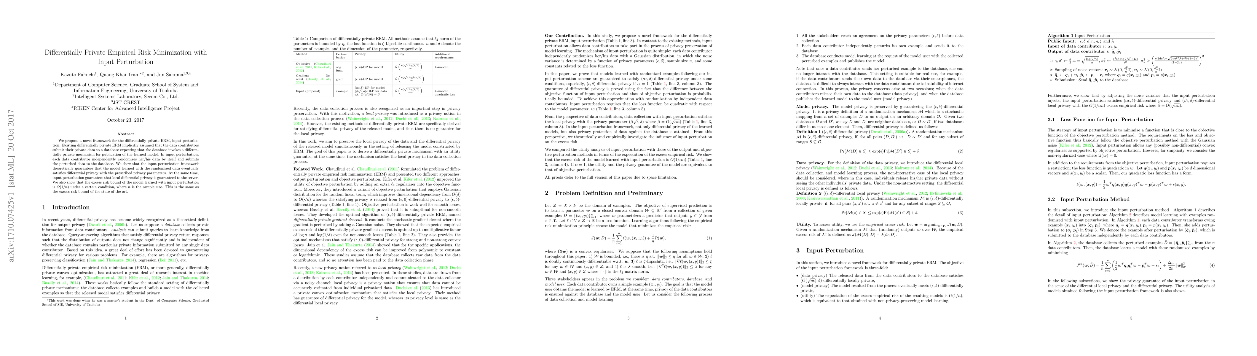 This paper introduces a novel differentially private empirical risk minimization (ERM) framework using input perturbation, where each data contributor independently randomizes their data before submission. It guarantees that the model learned from randomized data satisfies differential privacy and ensures local differential privacy for the server, with an excess risk bound of $O(1/n)$ for large sample sizes.