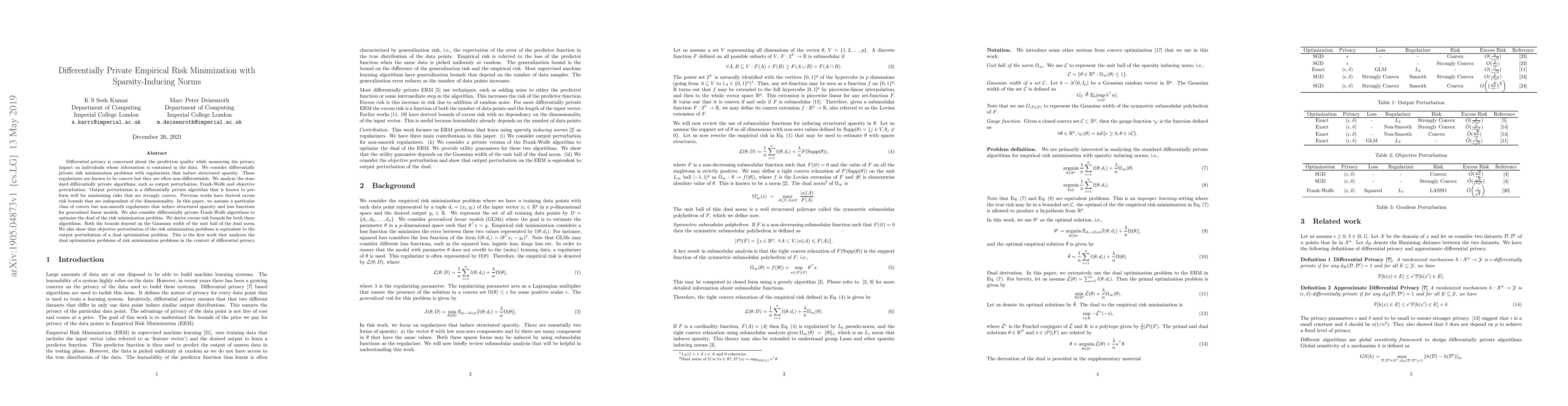 This paper investigates differentially private risk minimization using regularizers that promote structured sparsity, analyzing algorithms like output perturbation and differentially private Frank-Wolfe methods. It derives excess risk bounds dependent on the Gaussian width, showing equivalence between objective perturbation and dual optimization problems under differential privacy.