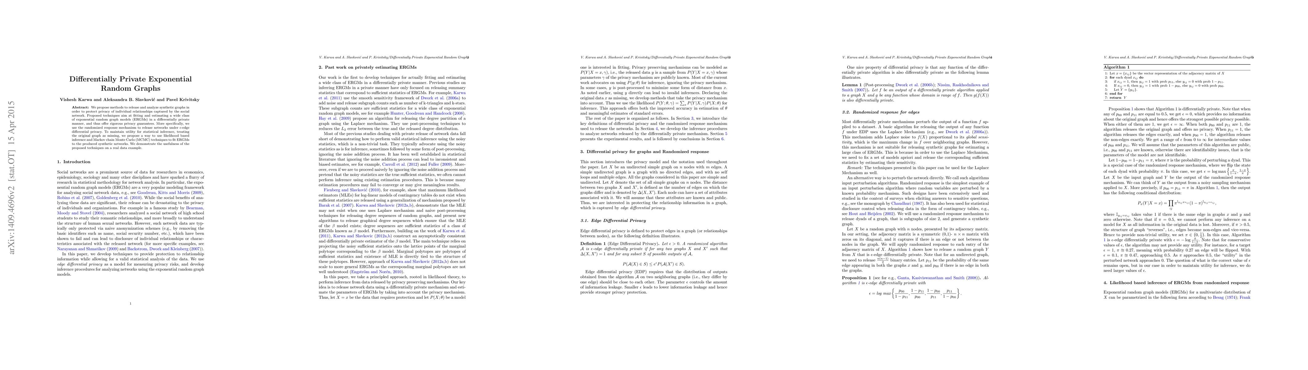 This paper proposes methods to generate and analyze synthetic graphs while ensuring the privacy of individual relationships using differentially private techniques. It employs randomized response for $\epsilon$-edge differential privacy and utilizes likelihood-based inference and MCMC for fitting exponential random graph models, demonstrating its effectiveness on real data.