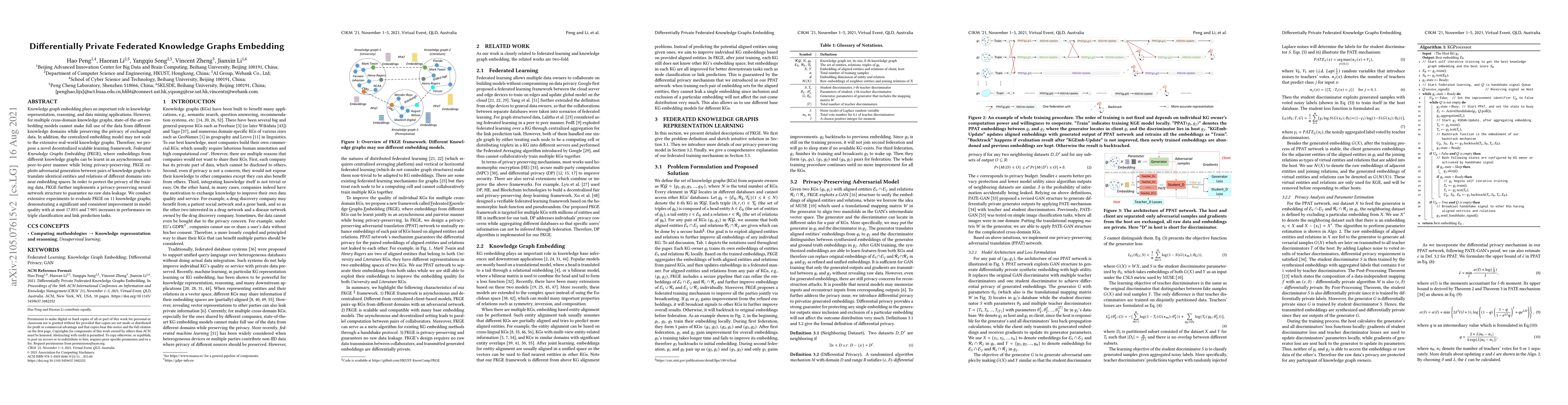 This paper presents Federated Knowledge Graphs Embedding (FKGE), a decentralized framework for learning embeddings across multiple knowledge graphs while preserving the privacy of shared data. FKGE employs adversarial generation and a privacy-preserving neural network to enhance model quality, achieving up to 17.85% improvement in triple classification and 7.90% in link prediction.