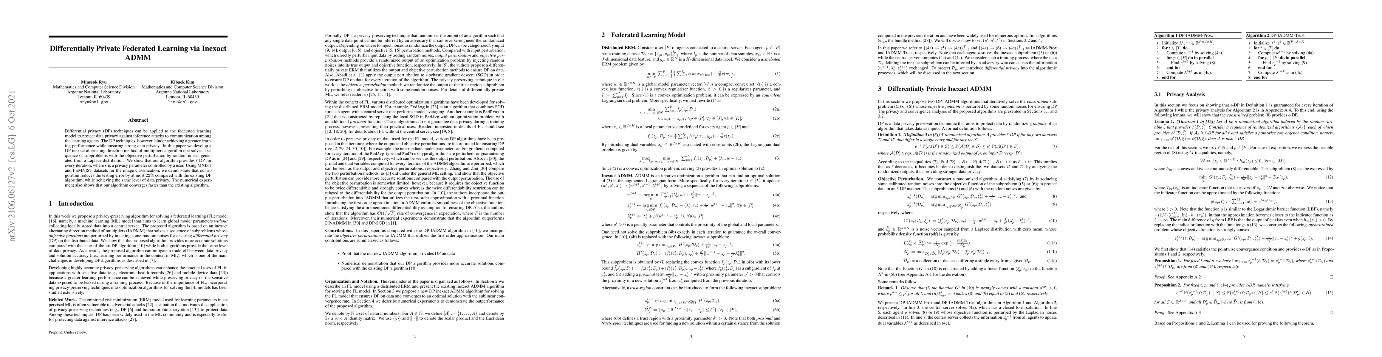 This paper proposes a differentially private federated learning algorithm using an inexact ADMM approach that introduces random noise to optimize subproblems. The method achieves $\bar{\epsilon}$-DP for each iteration and demonstrates improved performance and faster convergence compared to existing DP algorithms, as shown through experiments on MNIST and FEMNIST datasets.