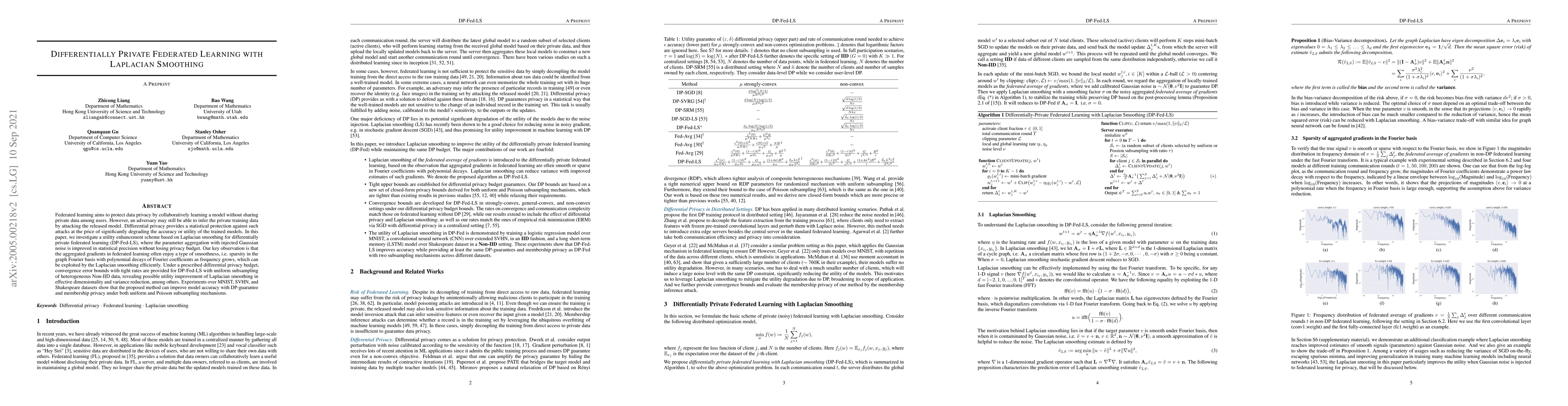 Federated learning aims to protect data privacy by collaboratively learning a model without sharing private data among users. However, an adversary may still be able to infer the private training data by attacking the released model. Differential privacy provides a statistical protection against such attacks at the price of significantly degrading the accuracy or utility of the trained models. In this paper, we investigate a utility enhancement scheme based on Laplacian smoothing for differentially private federated learning (DP-Fed-LS), where the parameter aggregation with injected Gaussian noise is improved in statistical precision without losing privacy budget. Our key observation is that the aggregated gradients in federated learning often enjoy a type of smoothness, i.e. sparsity in the graph Fourier basis with polynomial decays of Fourier coefficients as frequency grows, which can be exploited by the Laplacian smoothing efficiently. Under a prescribed differential privacy budget, convergence error bounds with tight rates are provided for DP-Fed-LS with uniform subsampling of heterogeneous Non-IID data, revealing possible utility improvement of Laplacian smoothing in effective dimensionality and variance reduction, among others. Experiments over MNIST, SVHN, and Shakespeare datasets show that the proposed method can improve model accuracy with DP-guarantee and membership privacy under both uniform and Poisson subsampling mechanisms.
