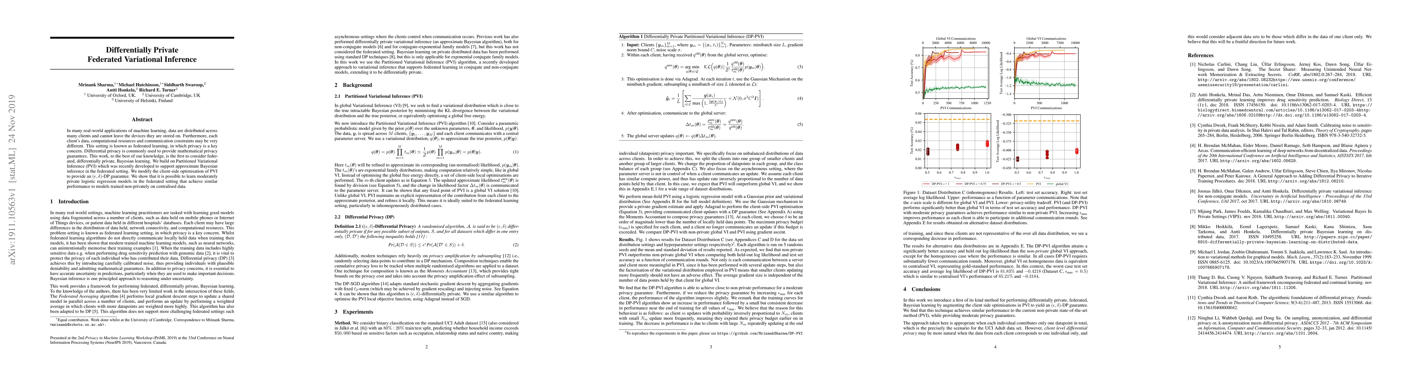 This paper introduces a differentially private federated learning approach for Bayesian inference using modified Partitioned Variational Inference (PVI). It demonstrates the feasibility of learning private logistic regression models in a federated setting, achieving comparable performance to non-private centralized models.