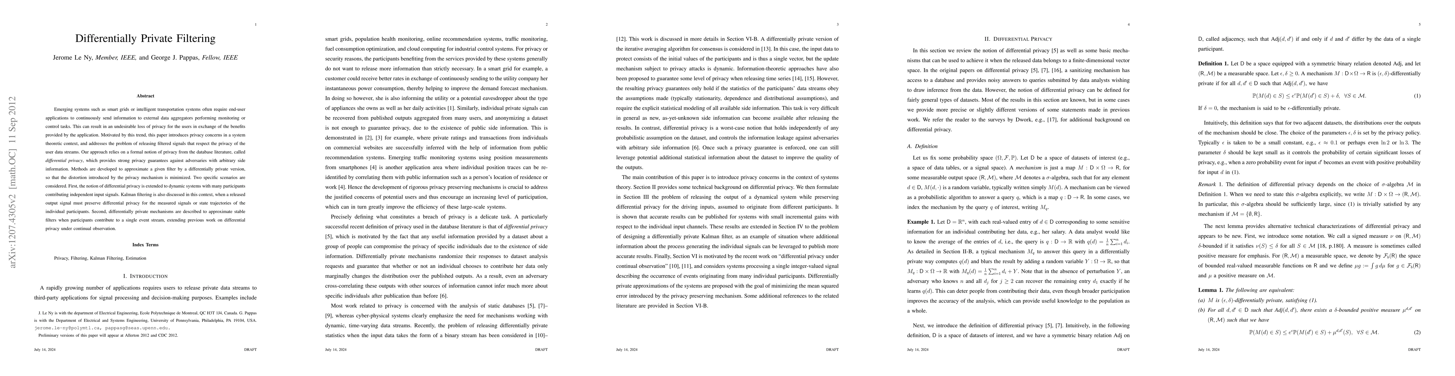 This paper introduces differential privacy to filter user data streams in smart systems, ensuring minimal distortion while preserving privacy. It extends differential privacy to dynamic systems and Kalman filtering, and develops mechanisms for stable filters in single event streams.