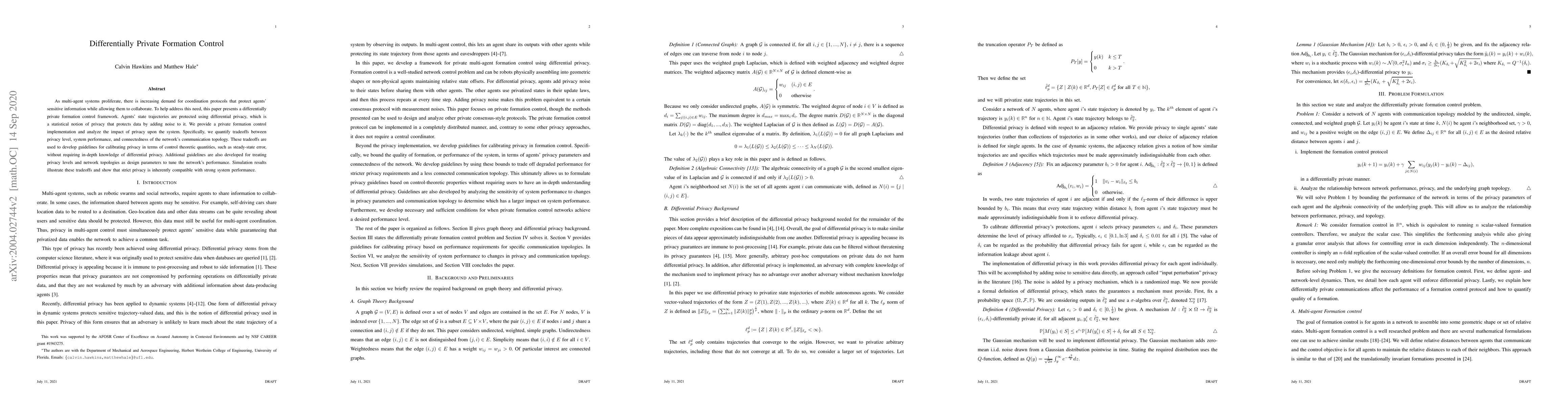 As multi-agent systems proliferate, there is increasing demand for coordination protocols that protect agents' sensitive information while allowing them to collaborate. To help address this need, this paper presents a differentially private formation control framework. Agents' state trajectories are protected using differential privacy, which is a statistical notion of privacy that protects data by adding noise to it. We provide a private formation control implementation and analyze the impact of privacy upon the system. Specifically, we quantify tradeoffs between privacy level, system performance, and connectedness of the network's communication topology. These tradeoffs are used to develop guidelines for calibrating privacy in terms of control theoretic quantities, such as steady-state error, without requiring in-depth knowledge of differential privacy. Additional guidelines are also developed for treating privacy levels and network topologies as design parameters to tune the network's performance. Simulation results illustrate these tradeoffs and show that strict privacy is inherently compatible with strong system performance.