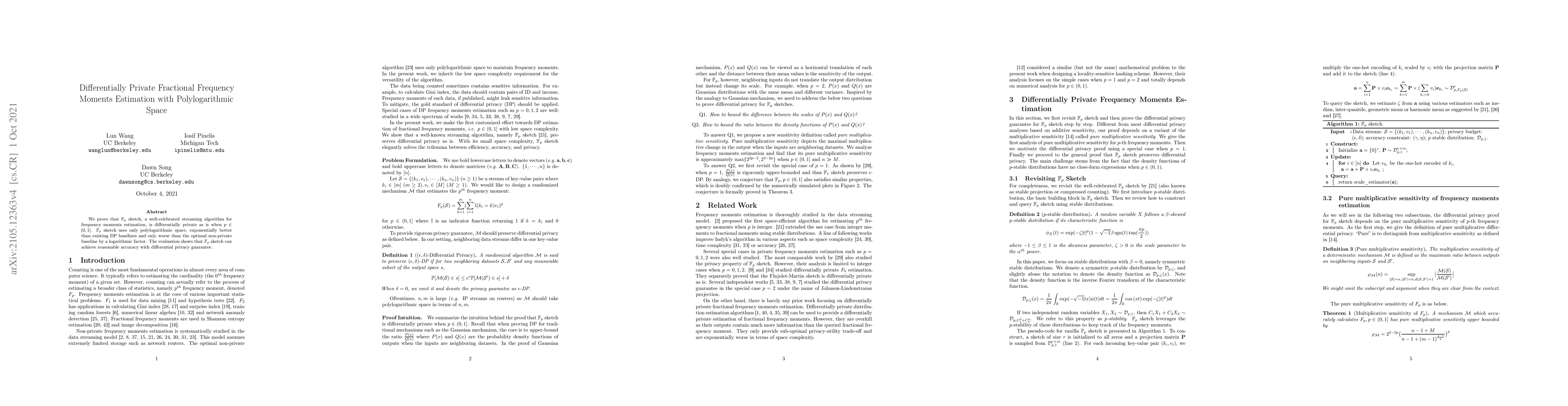 We prove that $\mathbb{F}_p$ sketch, a well-celebrated streaming algorithm for frequency moments estimation, is differentially private as is when $p\in(0, 1]$. $\mathbb{F}_p$ sketch uses only polylogarithmic space, exponentially better than existing DP baselines and only worse than the optimal non-private baseline by a logarithmic factor. The evaluation shows that $\mathbb{F}_p$ sketch can achieve reasonable accuracy with strong privacy guarantees.