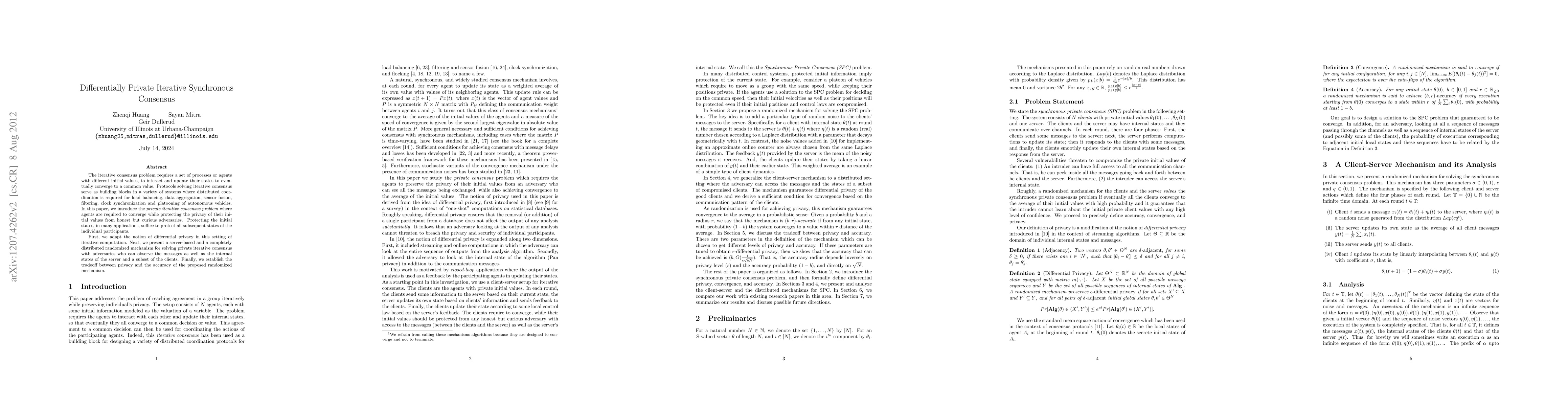 The iterative consensus problem requires a set of processes or agents with different initial values, to interact and update their states to eventually converge to a common value. Protocols solving iterative consensus serve as building blocks in a variety of systems where distributed coordination is required for load balancing, data aggregation, sensor fusion, filtering, clock synchronization and platooning of autonomous vehicles. In this paper, we introduce the private iterative consensus problem where agents are required to converge while protecting the privacy of their initial values from honest but curious adversaries. Protecting the initial states, in many applications, suffice to protect all subsequent states of the individual participants. First, we adapt the notion of differential privacy in this setting of iterative computation. Next, we present a server-based and a completely distributed randomized mechanism for solving private iterative consensus with adversaries who can observe the messages as well as the internal states of the server and a subset of the clients. Finally, we establish the tradeoff between privacy and the accuracy of the proposed randomized mechanism.