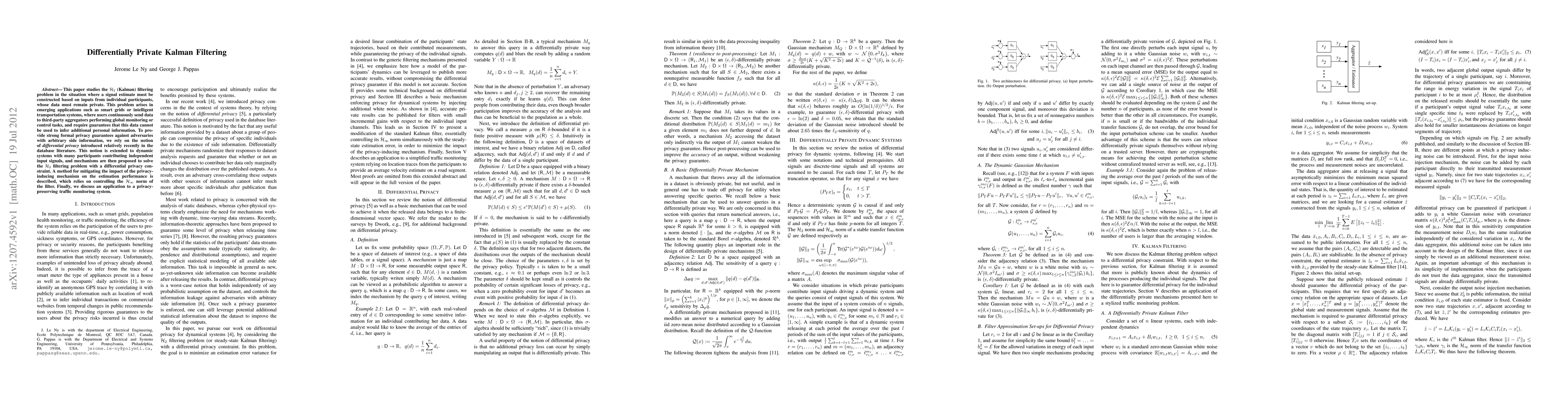 This paper studies the H2 (Kalman) filtering problem in the situation where a signal estimate must be constructed based on inputs from individual participants, whose data must remain private. This problem arises in emerging applications such as smart grids or intelligent transportation systems, where users continuously send data to third-party aggregators performing global monitoring or control tasks, and require guarantees that this data cannot be used to infer additional personal information. To provide strong formal privacy guarantees against adversaries with arbitrary side information, we rely on the notion of differential privacy introduced relatively recently in the database literature. This notion is extended to dynamic systems with many participants contributing independent input signals, and mechanisms are then proposed to solve the H2 filtering problem with a differential privacy constraint. A method for mitigating the impact of the privacy-inducing mechanism on the estimation performance is described, which relies on controlling the Hinfinity norm of the filter. Finally, we discuss an application to a privacy-preserving traffic monitoring system.
