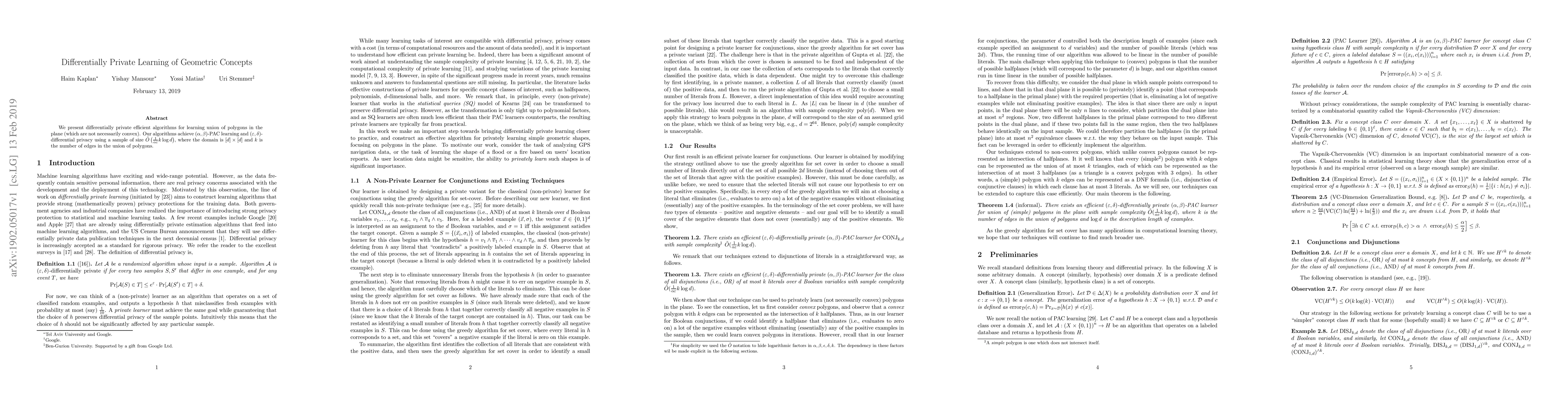 This paper introduces differentially private algorithms for learning unions of non-convex polygons in the plane, achieving $(\alpha,\beta)$-PAC learning and $(\epsilon,\delta)$-differential privacy with sample complexity $\tilde{O}\left(\frac{1}{\alpha\epsilon}k\log d\right)$.