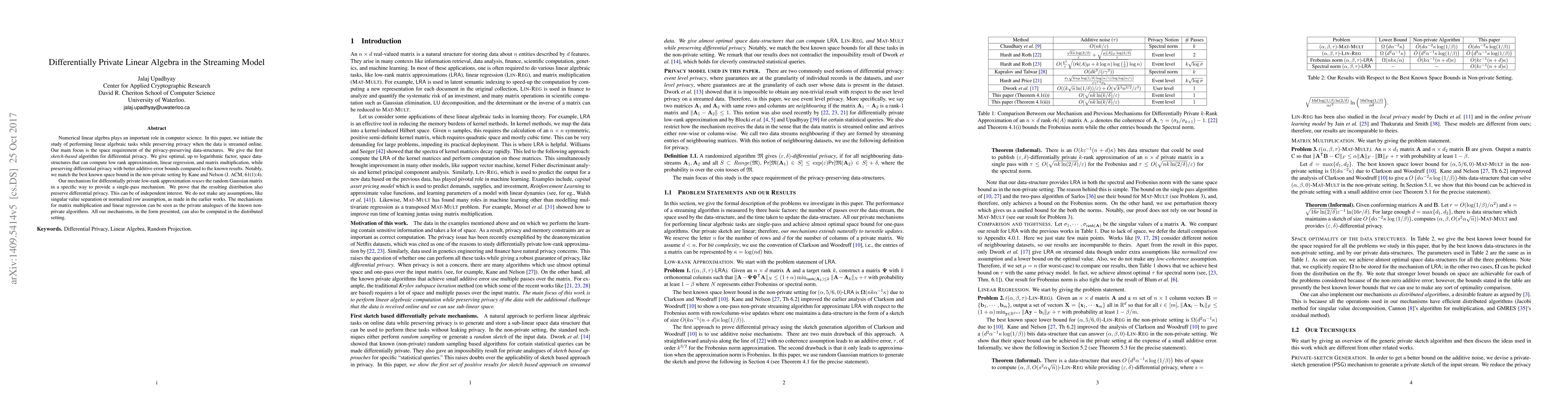 Numerical linear algebra plays an important role in computer science. In this paper, we initiate the study of performing linear algebraic tasks while preserving privacy when the data is streamed online. Our main focus is the space requirement of the privacy-preserving data-structures. We give the first {\em sketch-based} algorithm for differential privacy. We give optimal, up to logarithmic factor, space data-structures that can compute low rank approximation, linear regression, and matrix multiplication, while preserving differential privacy with better additive error bounds compared to the known results. Notably, we match the best known space bound in the non-private setting by Kane and Nelson (J. ACM, 61(1):4). Our mechanism for differentially private low-rank approximation {\em reuses} the random Gaussian matrix in a specific way to provide a single-pass mechanism. We prove that the resulting distribution also preserve differential privacy. This can be of independent interest. We do not make any assumptions, like singular value separation or normalized row assumption, as made in the earlier works. The mechanisms for matrix multiplication and linear regression can be seen as the private analogues of the known non-private algorithms. All our mechanisms, in the form presented, can also be computed in the distributed setting.