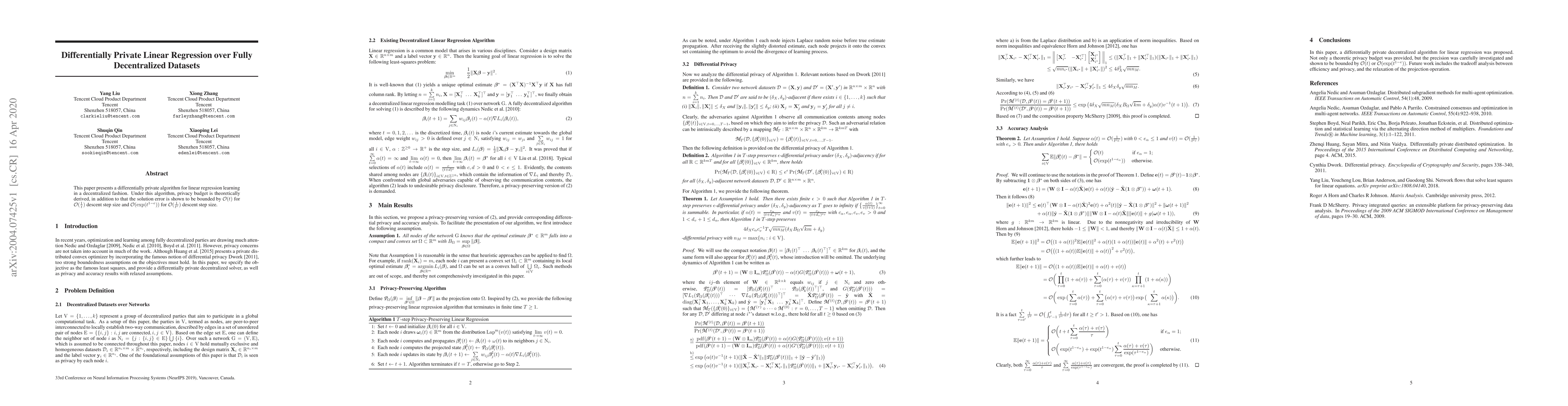 This paper introduces a differentially private algorithm for decentralized linear regression, deriving a theoretical privacy budget and demonstrating bounded solution error under specific descent step sizes. The error bounds are $O(t)$ for $O(1/t)$ step size and $O(\exp(t^{1-e}))$ for $O(t^{-e})$ step size.