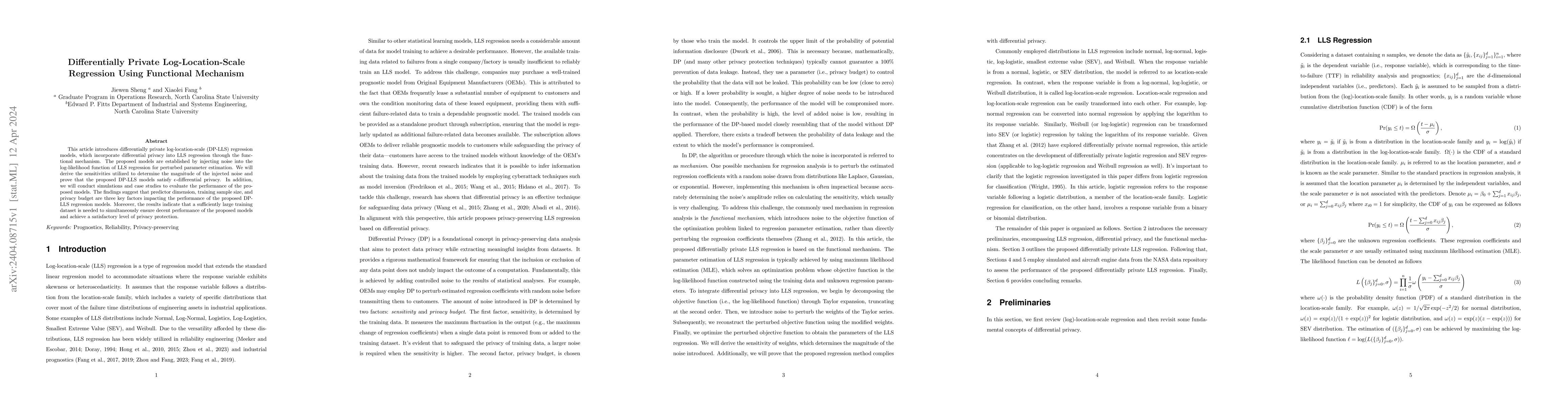 This paper presents differentially private log-location-scale regression models using a functional mechanism, injecting noise into the log-likelihood function to achieve $\epsilon$-differential privacy. The study highlights that predictor dimension, training sample size, and privacy budget significantly affect model performance, suggesting the need for large datasets to balance performance and privacy.