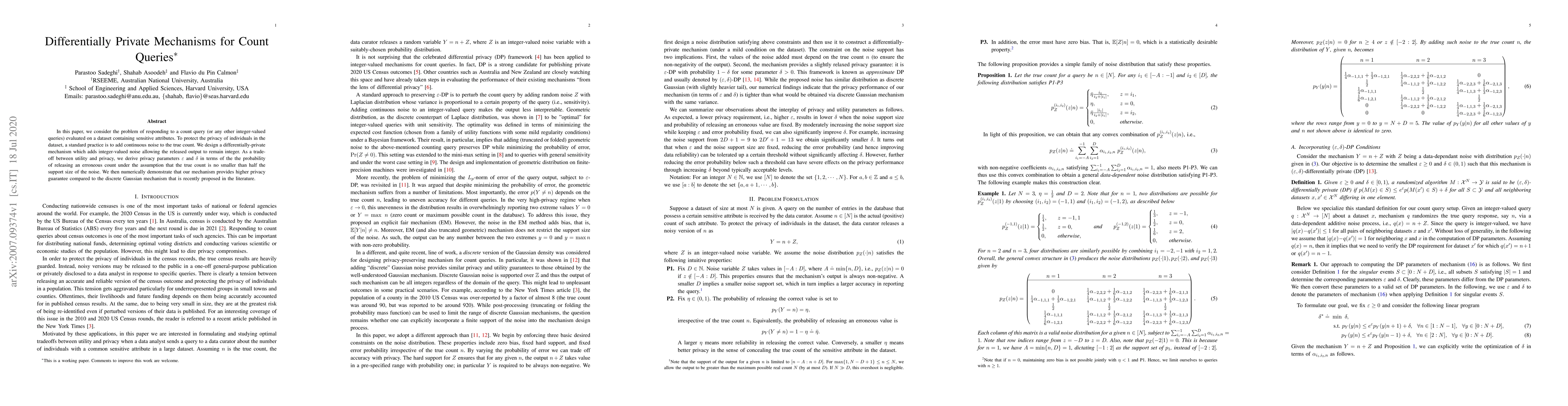 This paper introduces a differentially private mechanism for count queries that adds integer-valued noise to maintain integer outputs. It provides higher privacy guarantees compared to the discrete Gaussian mechanism, balancing utility and privacy through parameters $\eps$ and $\delta$.