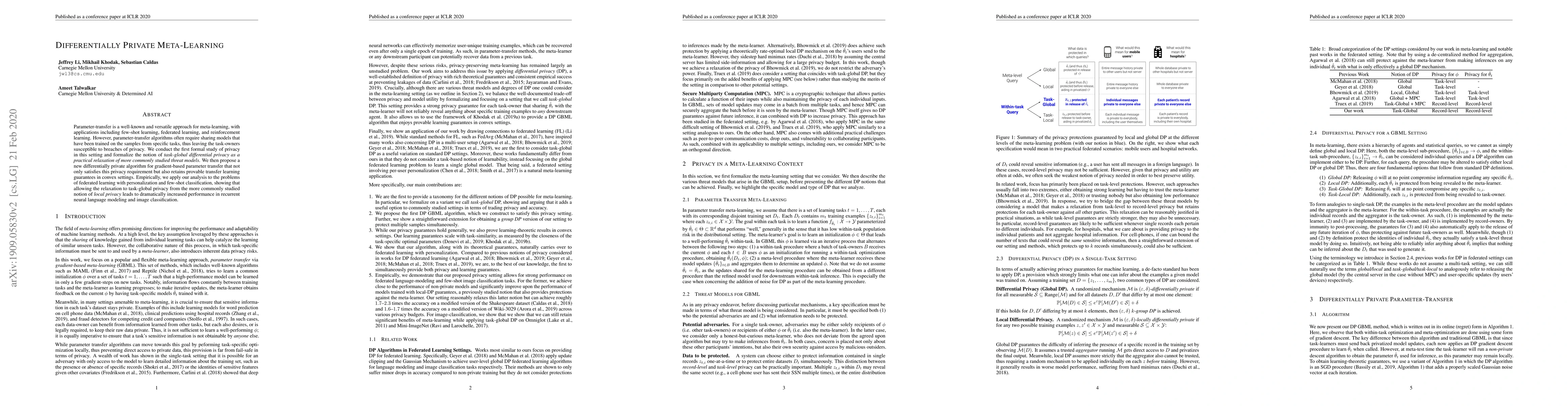 Parameter-transfer is a well-known and versatile approach for meta-learning, with applications including few-shot learning, federated learning, and reinforcement learning. However, parameter-transfer algorithms often require sharing models that have been trained on the samples from specific tasks, thus leaving the task-owners susceptible to breaches of privacy. We conduct the first formal study of privacy in this setting and formalize the notion of task-global differential privacy as a practical relaxation of more commonly studied threat models. We then propose a new differentially private algorithm for gradient-based parameter transfer that not only satisfies this privacy requirement but also retains provable transfer learning guarantees in convex settings. Empirically, we apply our analysis to the problems of federated learning with personalization and few-shot classification, showing that allowing the relaxation to task-global privacy from the more commonly studied notion of local privacy leads to dramatically increased performance in recurrent neural language modeling and image classification.