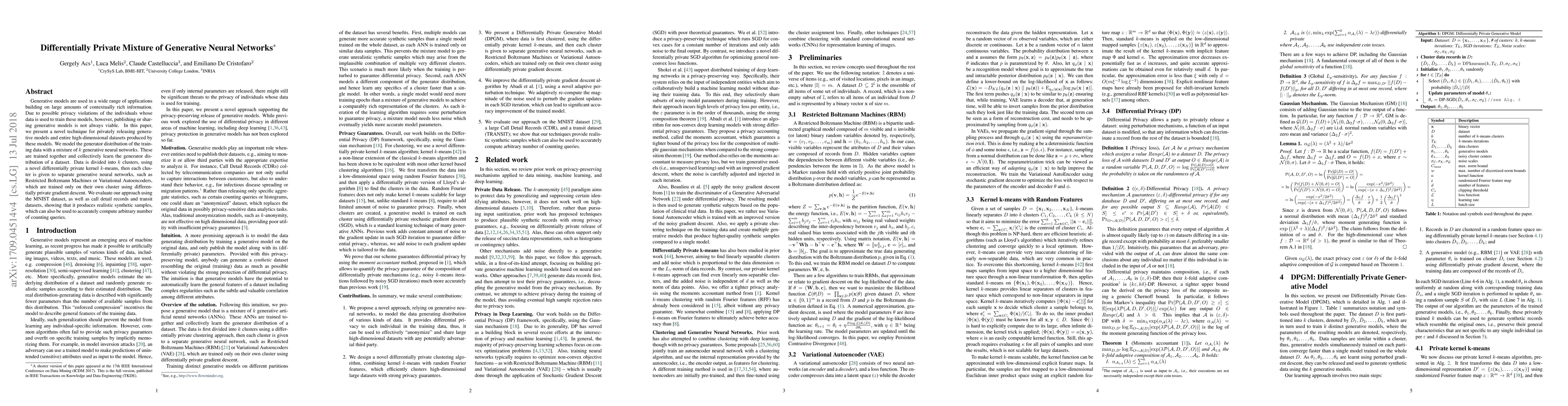 This paper introduces a differentially private method for generating synthetic data using a mixture of generative neural networks, ensuring privacy while maintaining data utility. It employs a novel differentially private clustering technique to partition data before training separate generative models on each cluster, evaluated on MNIST and real-world datasets.