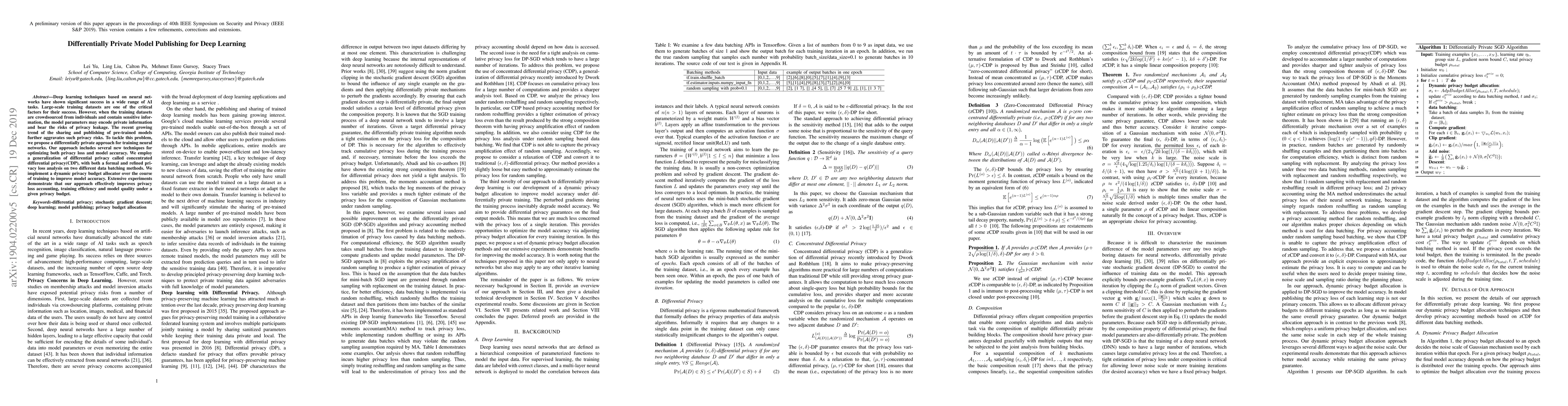 Deep learning techniques based on neural networks have shown significant success in a wide range of AI tasks. Large-scale training datasets are one of the critical factors for their success. However, when the training datasets are crowdsourced from individuals and contain sensitive information, the model parameters may encode private information and bear the risks of privacy leakage. The recent growing trend of the sharing and publishing of pre-trained models further aggravates such privacy risks. To tackle this problem, we propose a differentially private approach for training neural networks. Our approach includes several new techniques for optimizing both privacy loss and model accuracy. We employ a generalization of differential privacy called concentrated differential privacy(CDP), with both a formal and refined privacy loss analysis on two different data batching methods. We implement a dynamic privacy budget allocator over the course of training to improve model accuracy. Extensive experiments demonstrate that our approach effectively improves privacy loss accounting, training efficiency and model quality under a given privacy budget.