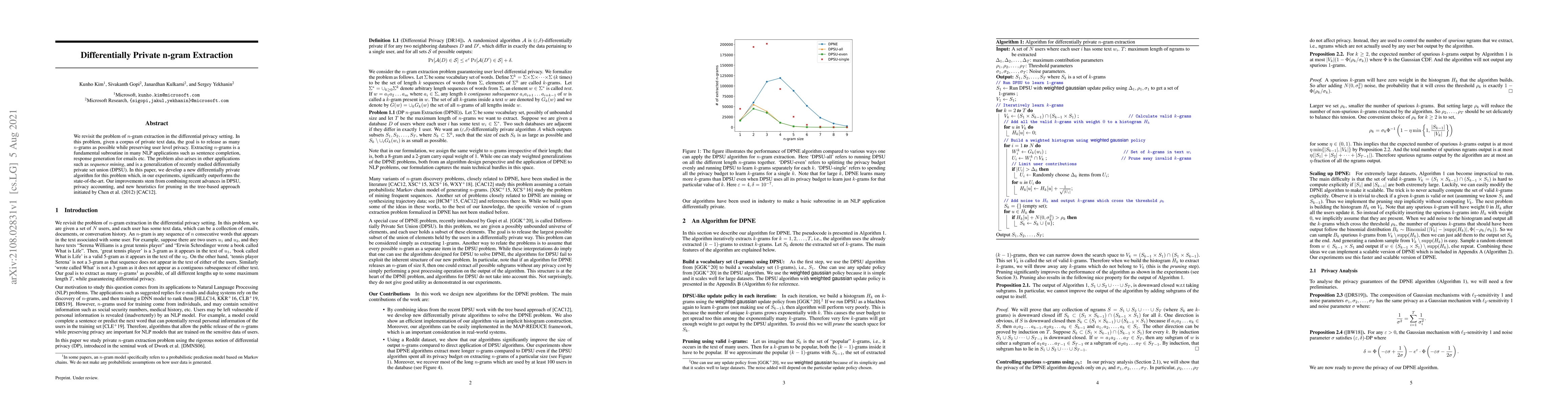 We revisit the problem of $n$-gram extraction in the differential privacy setting. In this problem, given a corpus of private text data, the goal is to release as many $n$-grams as possible while preserving user level privacy. Extracting $n$-grams is a fundamental subroutine in many NLP applications such as sentence completion, response generation for emails etc. The problem also arises in other applications such as sequence mining, and is a generalization of recently studied differentially private set union (DPSU). In this paper, we develop a new differentially private algorithm for this problem which, in our experiments, significantly outperforms the state-of-the-art. Our improvements stem from combining recent advances in DPSU, privacy accounting, and new heuristics for pruning in the tree-based approach initiated by Chen et al. (2012).