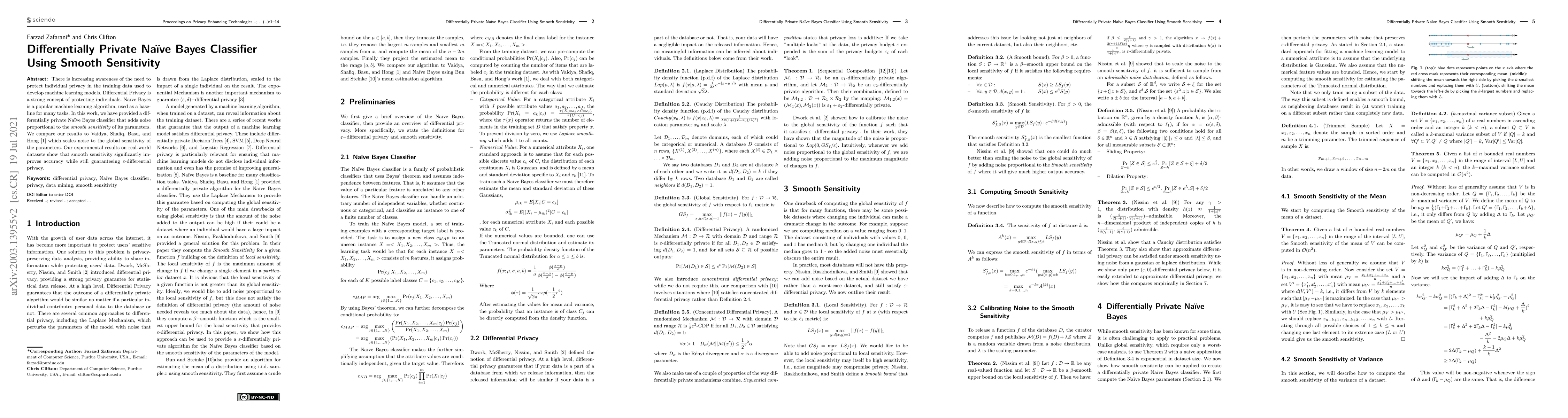 This paper proposes a differentially private Naive Bayes classifier that uses Smooth Sensitivity to add noise, improving accuracy compared to methods using global sensitivity while maintaining $\varepsilon$-differential privacy. Experiments on real-world datasets demonstrate significant accuracy improvements.