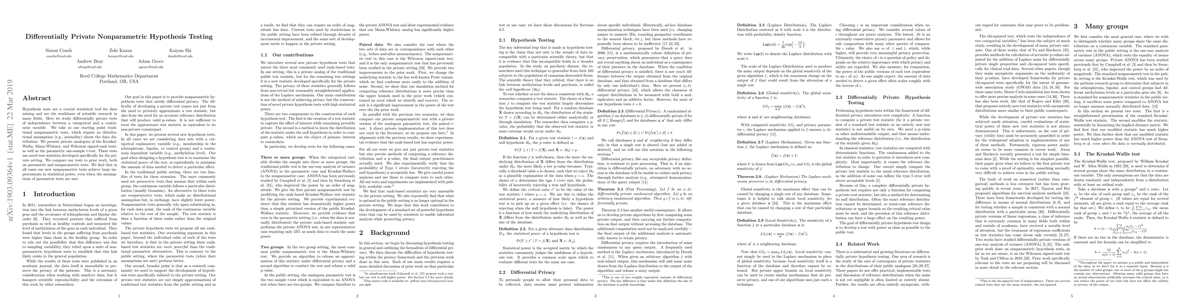 This paper develops differentially private versions of nonparametric hypothesis tests, including the Kruskal-Wallis, Mann-Whitney, and Wilcoxon signed-rank tests, alongside a private one-sample t-test. The new tests show significant improvements in statistical power compared to prior methods, even under conditions where parametric tests are typically preferred.