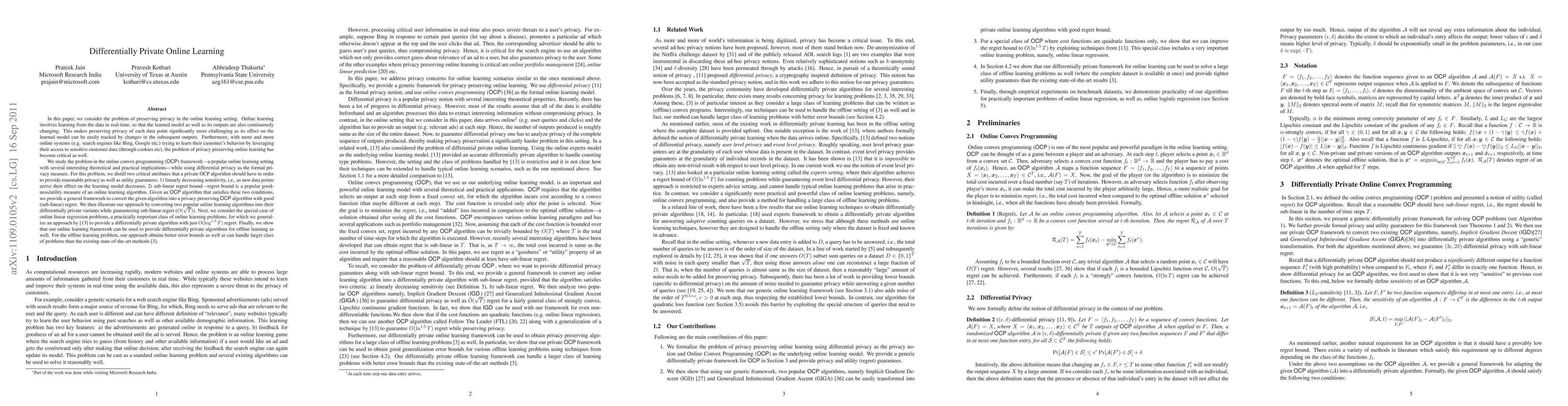 In this paper, we consider the problem of preserving privacy in the online learning setting. We study the problem in the online convex programming (OCP) framework---a popular online learning setting with several interesting theoretical and practical implications---while using differential privacy as the formal privacy measure. For this problem, we distill two critical attributes that a private OCP algorithm should have in order to provide reasonable privacy as well as utility guarantees: 1) linearly decreasing sensitivity, i.e., as new data points arrive their effect on the learning model decreases, 2) sub-linear regret bound---regret bound is a popular goodness/utility measure of an online learning algorithm. Given an OCP algorithm that satisfies these two conditions, we provide a general framework to convert the given algorithm into a privacy preserving OCP algorithm with good (sub-linear) regret. We then illustrate our approach by converting two popular online learning algorithms into their differentially private variants while guaranteeing sub-linear regret ($O(\sqrt{T})$). Next, we consider the special case of online linear regression problems, a practically important class of online learning problems, for which we generalize an approach by Dwork et al. to provide a differentially private algorithm with just $O(\log^{1.5} T)$ regret. Finally, we show that our online learning framework can be used to provide differentially private algorithms for offline learning as well. For the offline learning problem, our approach obtains better error bounds as well as can handle larger class of problems than the existing state-of-the-art methods Chaudhuri et al.