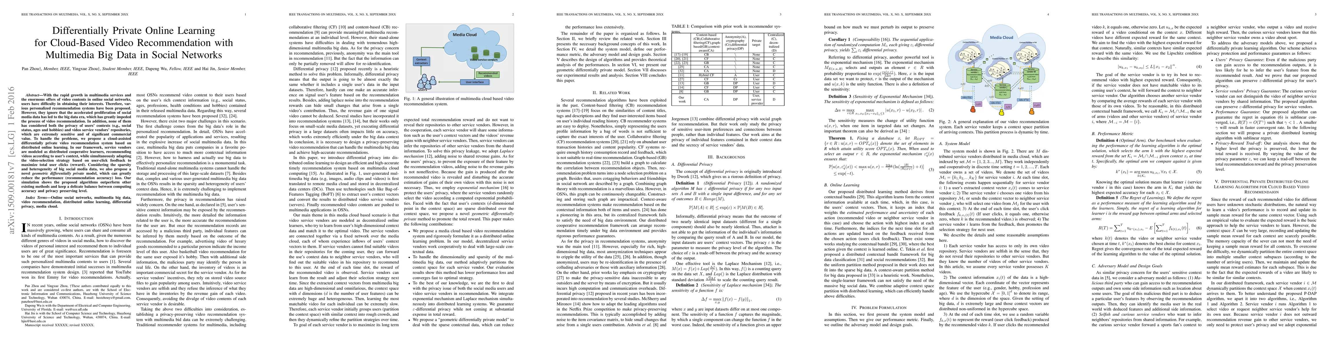 This paper proposes a differentially private video recommendation system leveraging cloud-based online learning for social networks, addressing the challenges of big data and user privacy. The system uses distributed cooperative learning and a novel geometric differentially private model to optimize recommendations while maintaining a balance between accuracy and privacy.