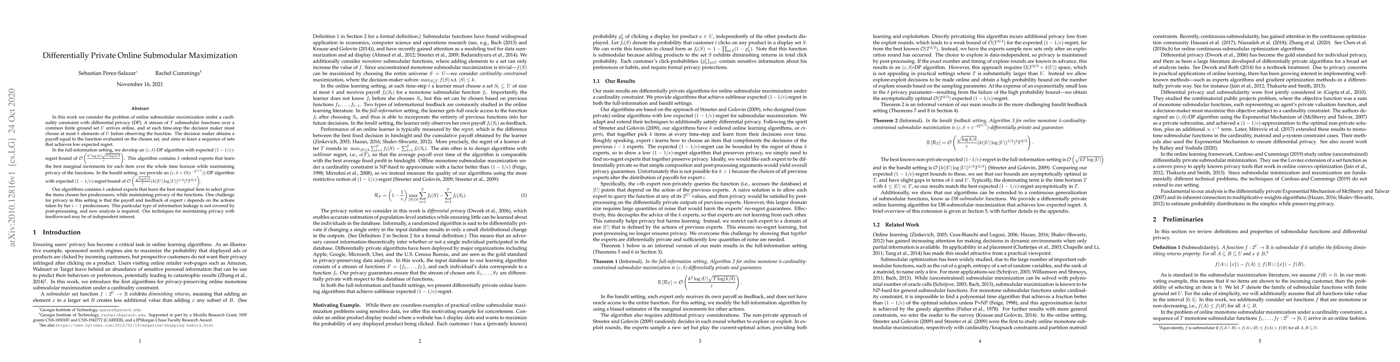 This paper presents differentially private algorithms for online submodular maximization under cardinality constraints, achieving low expected regret. The authors develop $(\varepsilon,\delta)$-DP algorithms for both full-information and bandit settings, employing $k$ ordered experts to maintain privacy while optimizing marginal increments or selections.
