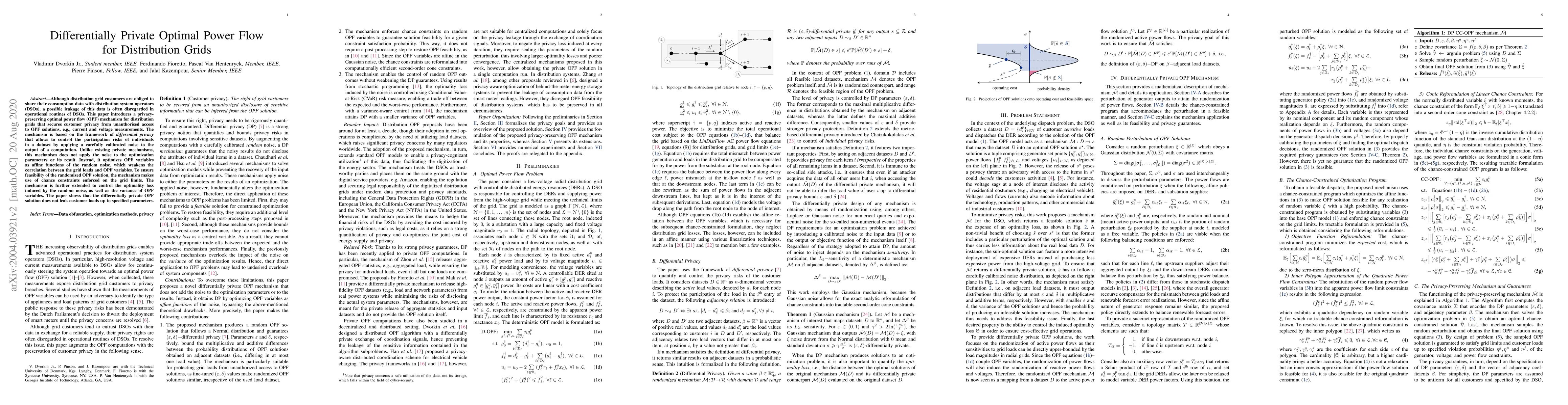 This paper presents a differentially private optimal power flow mechanism for distribution grids that secures customer privacy by applying noise to computation outputs, optimizing OPF variables as affine functions of the noise, and enforcing chance constraints for feasibility, while minimizing optimality loss and variance of OPF variables. The proposed mechanism ensures no leakage of customer loads.