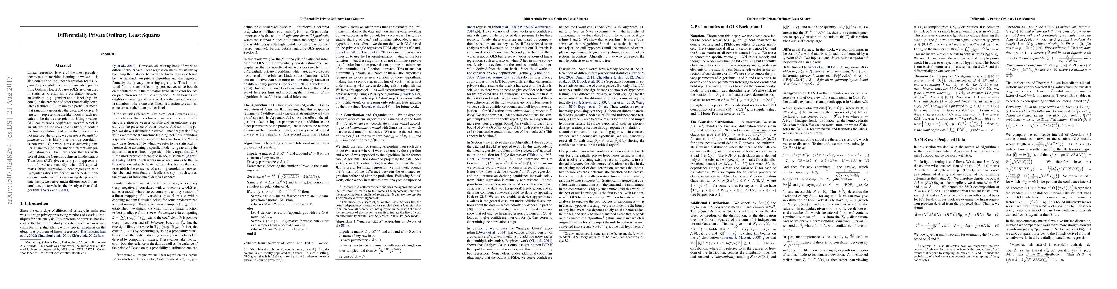 Linear regression is one of the most prevalent techniques in machine learning, however, it is also common to use linear regression for its \emph{explanatory} capabilities rather than label prediction. Ordinary Least Squares (OLS) is often used in statistics to establish a correlation between an attribute (e.g. gender) and a label (e.g. income) in the presence of other (potentially correlated) features. OLS assumes a particular model that randomly generates the data, and derives \emph{$t$-values} --- representing the likelihood of each real value to be the true correlation. Using $t$-values, OLS can release a \emph{confidence interval}, which is an interval on the reals that is likely to contain the true correlation, and when this interval does not intersect the origin, we can \emph{reject the null hypothesis} as it is likely that the true correlation is non-zero. Our work aims at achieving similar guarantees on data under differentially private estimators. First, we show that for well-spread data, the Gaussian Johnson-Lindenstrauss Transform (JLT) gives a very good approximation of $t$-values, secondly, when JLT approximates Ridge regression (linear regression with $l_2$-regularization) we derive, under certain conditions, confidence intervals using the projected data, lastly, we derive, under different conditions, confidence intervals for the "Analyze Gauss" algorithm (Dwork et al, STOC 2014).