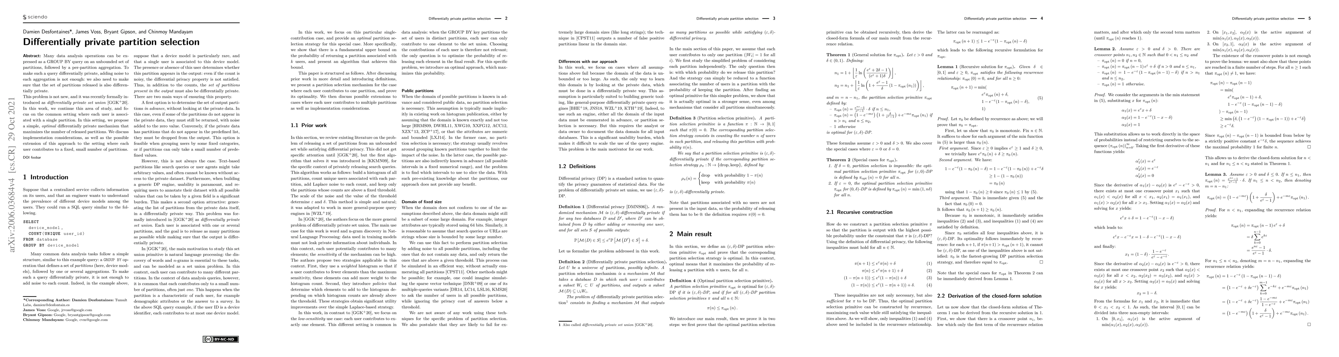 This paper proposes an optimal differentially private mechanism for selecting partitions in data analysis, ensuring that the set of partitions released is also differentially private. The approach maximizes the number of released partitions and considers implementation details and potential extensions to scenarios where users contribute to multiple partitions.