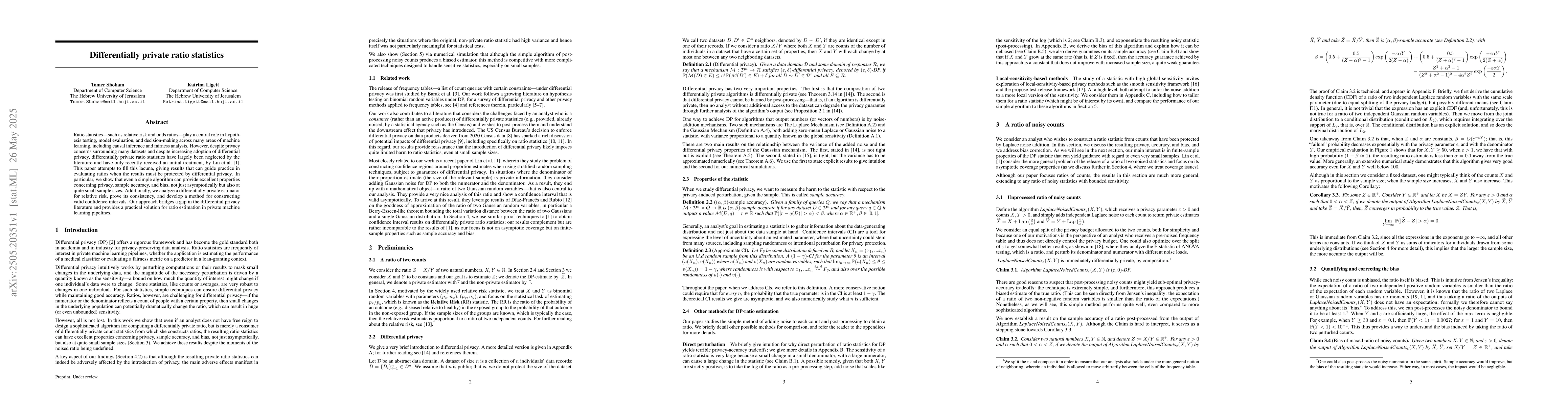 The paper presents a method for differentially private ratio statistics, focusing on relative risk and odds ratios, and demonstrates the effectiveness of a simple algorithm for privacy, sample accuracy, and bias at small sample sizes. It also analyzes a differentially private estimator for relative risk, proves its consistency, and develops a method for constructing valid confidence intervals.