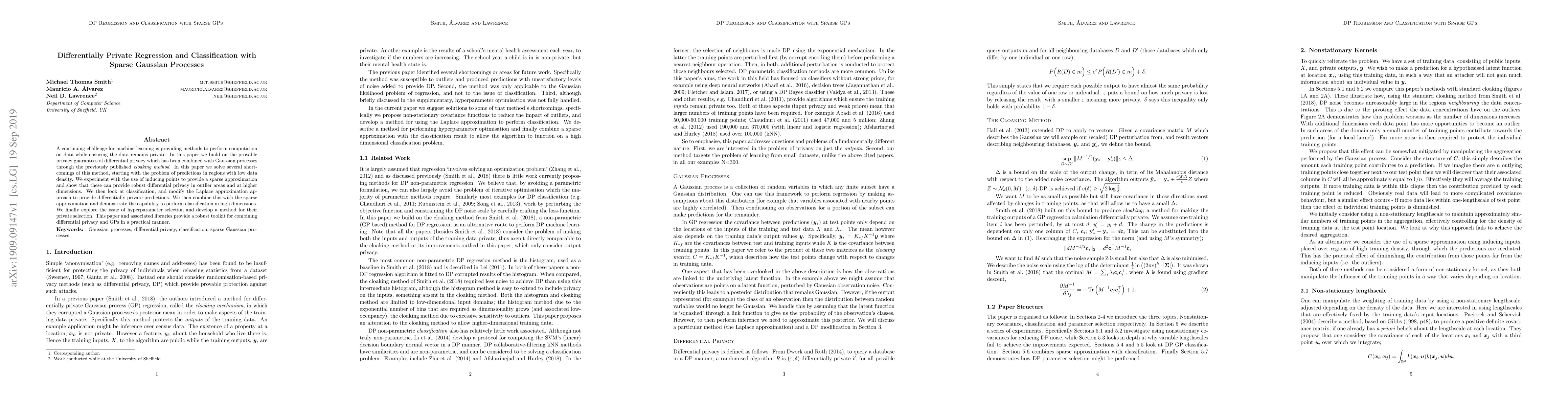 A continuing challenge for machine learning is providing methods to perform computation on data while ensuring the data remains private. In this paper we build on the provable privacy guarantees of differential privacy which has been combined with Gaussian processes through the previously published \emph{cloaking method}. In this paper we solve several shortcomings of this method, starting with the problem of predictions in regions with low data density. We experiment with the use of inducing points to provide a sparse approximation and show that these can provide robust differential privacy in outlier areas and at higher dimensions. We then look at classification, and modify the Laplace approximation approach to provide differentially private predictions. We then combine this with the sparse approximation and demonstrate the capability to perform classification in high dimensions. We finally explore the issue of hyperparameter selection and develop a method for their private selection. This paper and associated libraries provide a robust toolkit for combining differential privacy and GPs in a practical manner.